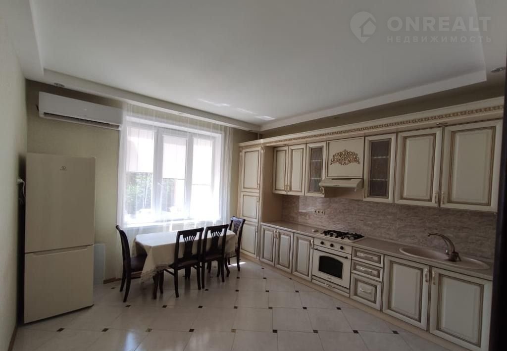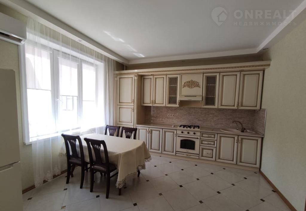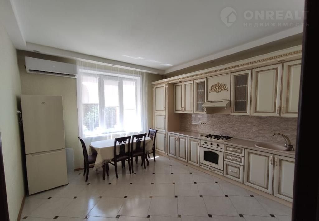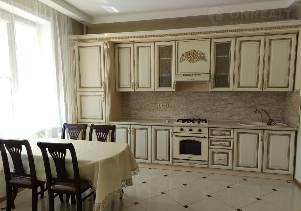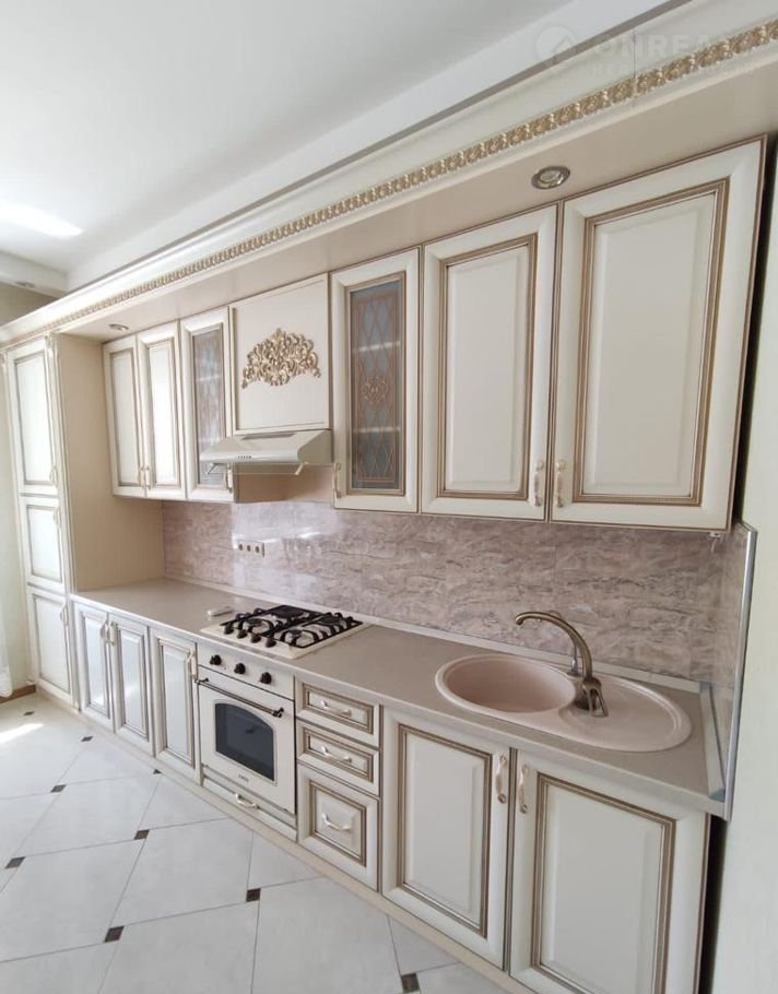 Хозяек порадует большая кухня со множеством навесных и напольных шкафов.