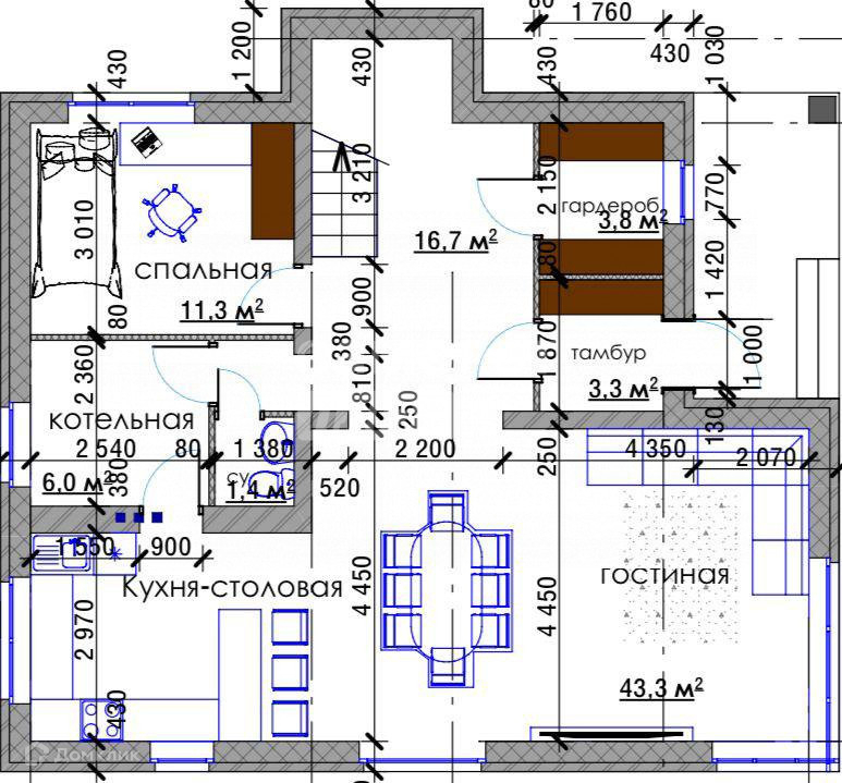 На 1 этаже расположены: огромная кухня-гостинная, котельная, санузел, гардероб и гостевая спальня.