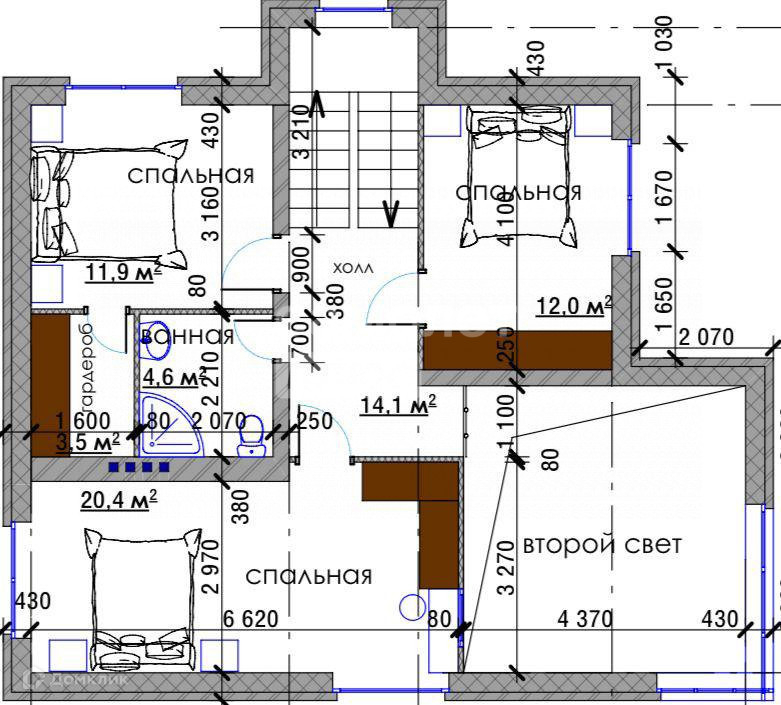 На 2 этаже; санузел, три спальни, в одной из которых своя гардеробная.