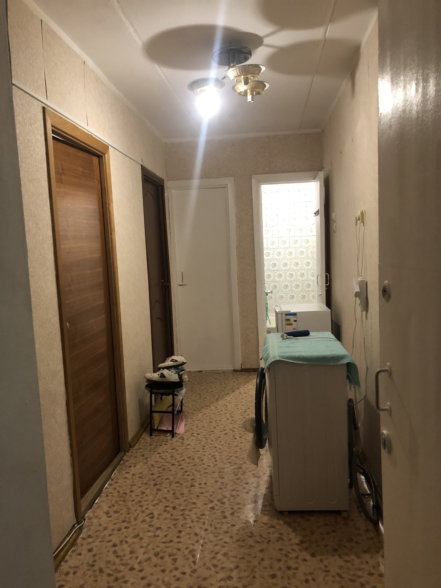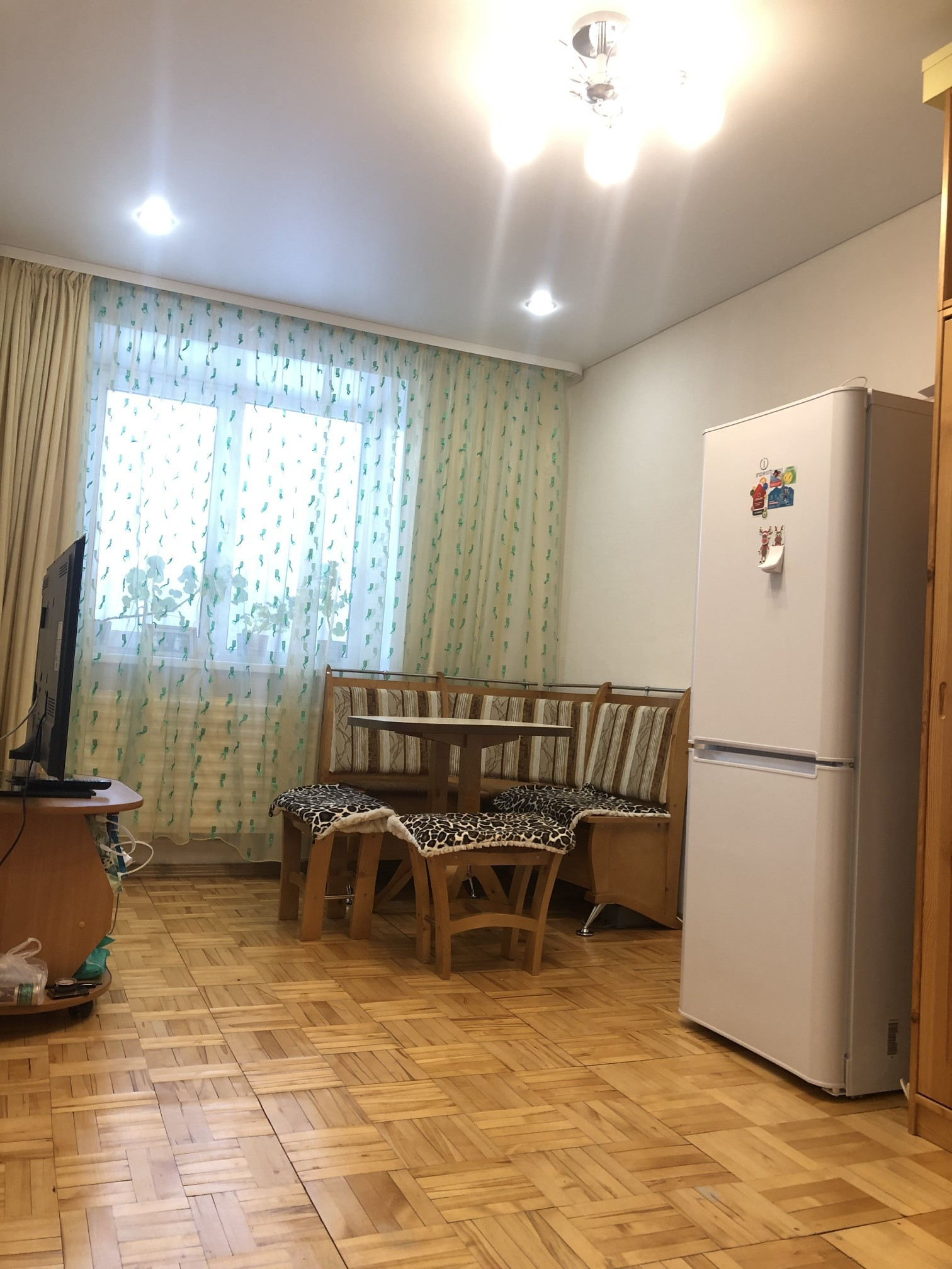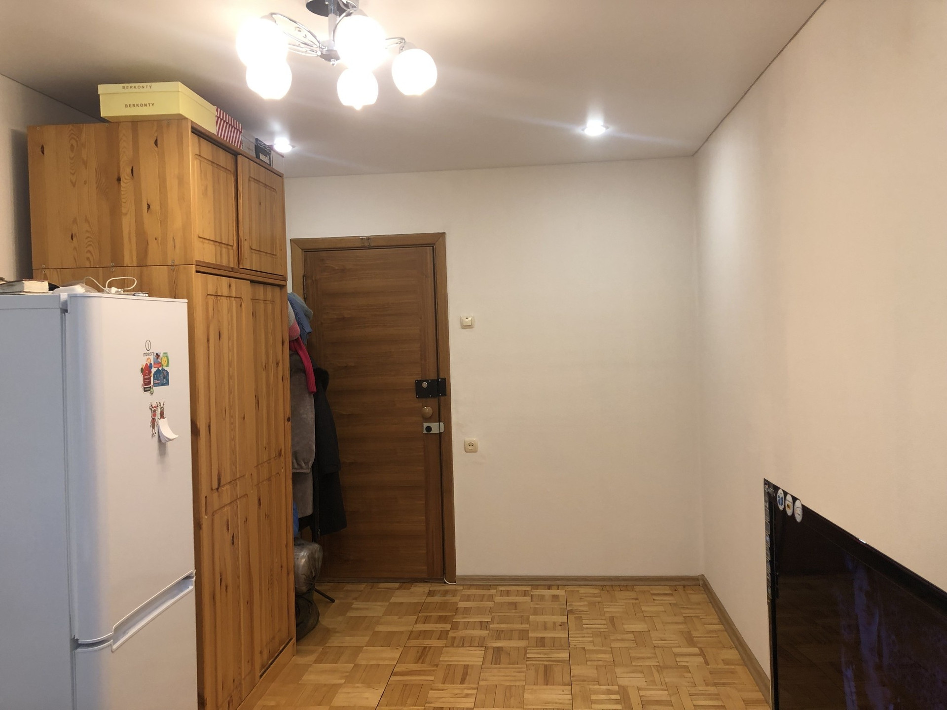 - Состояние отличное, сделан ремонт : окно-стеклопакет (окна выходят во двор), натяжной потолок, отциклеванный паркет, дверь – натуральный шпон.