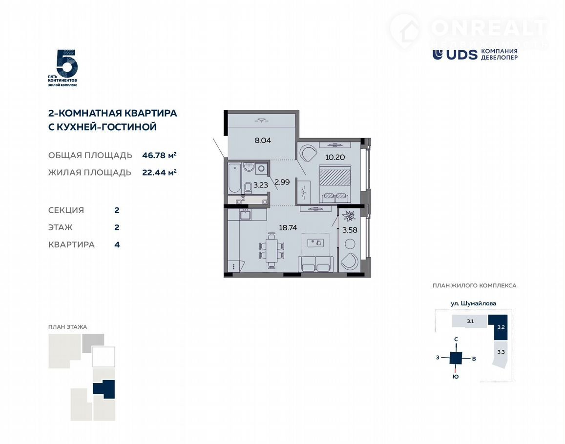 2-комнатная квартира, 46.8 м2, этаж 2 / 17, на продажу в Ижевске, улица Шумайлова, 37Т