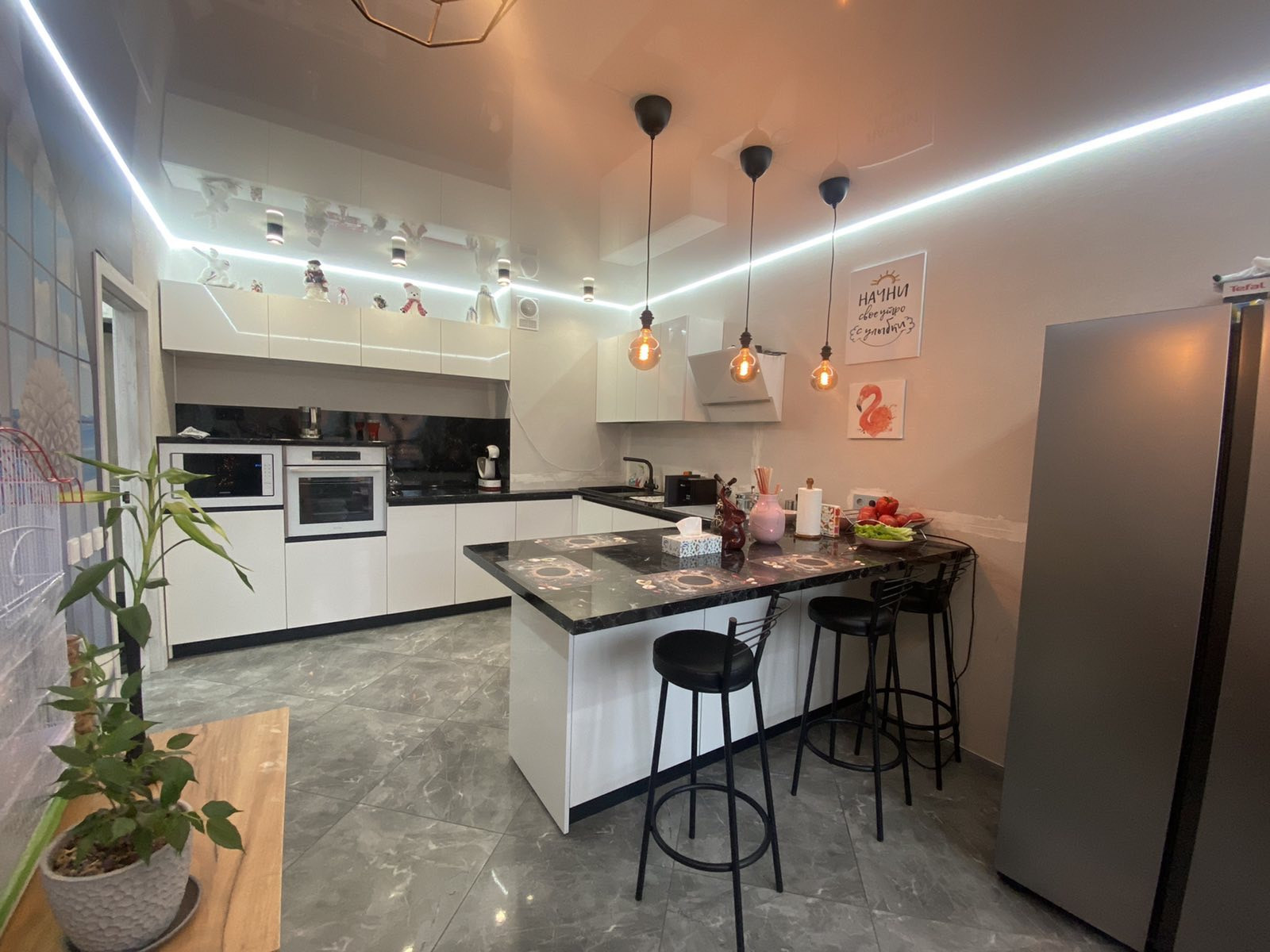 Остаётся кухонный гарнитур с встроенной техникой (микроволновая печь, духовой шкаф, варочная индукционная панель, вытяжка, посудомоечная машина)