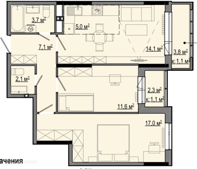 Общая площадь 60.5 м2