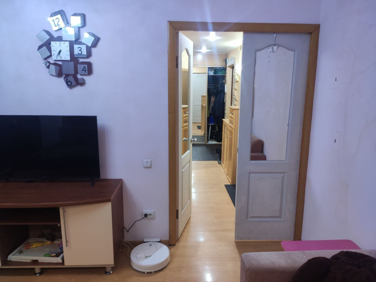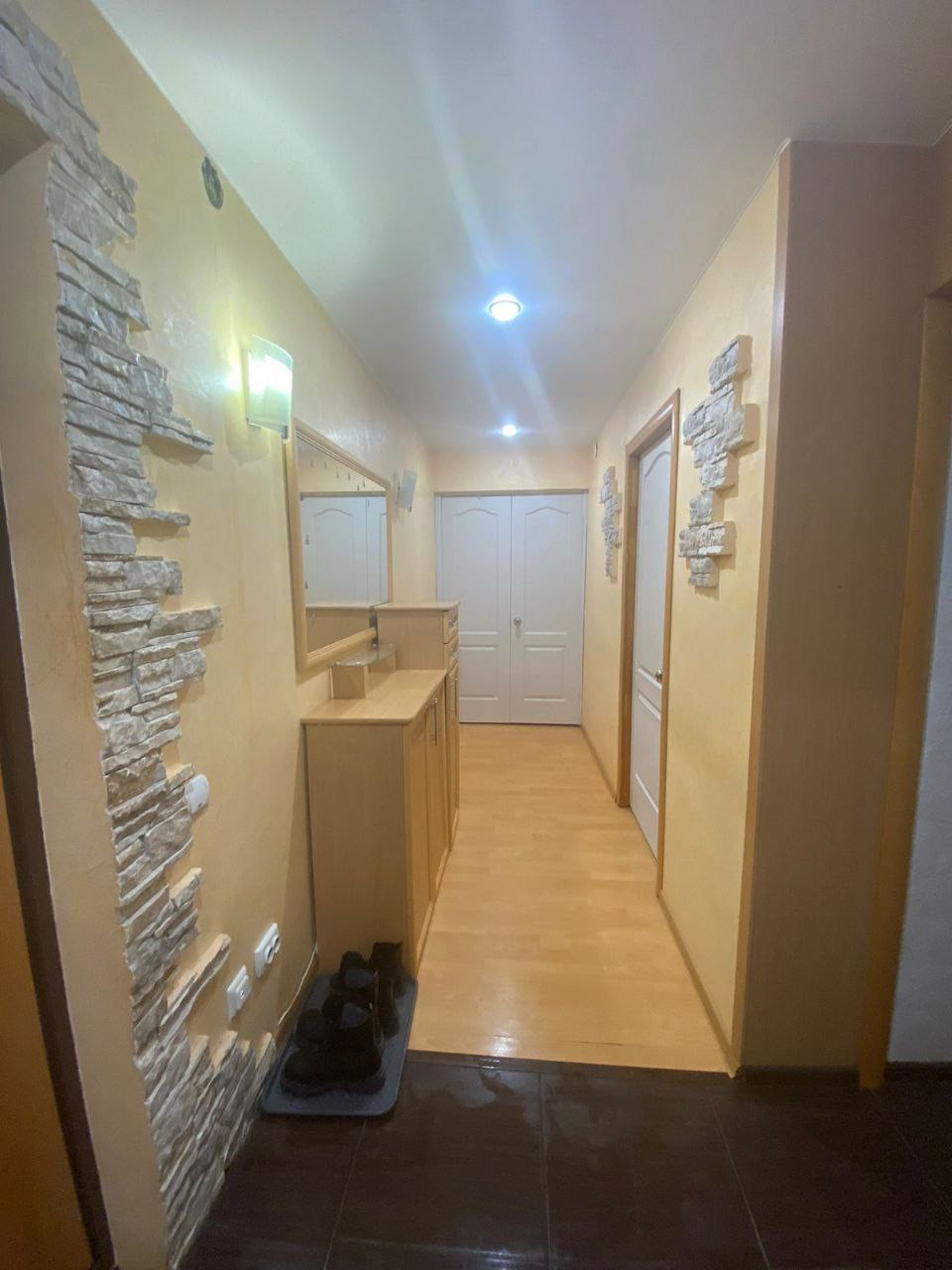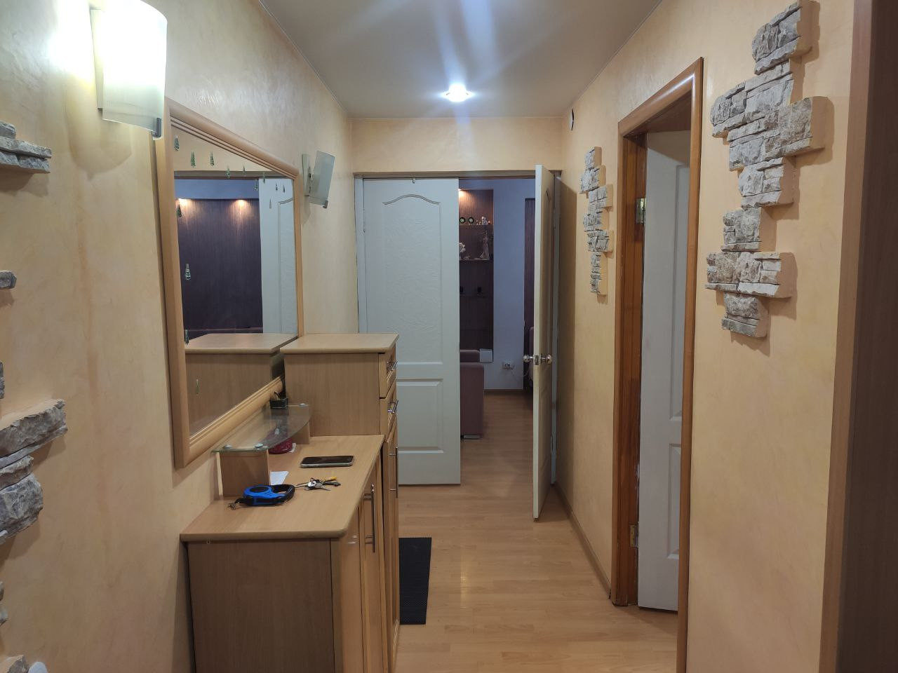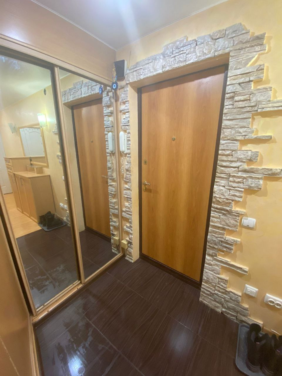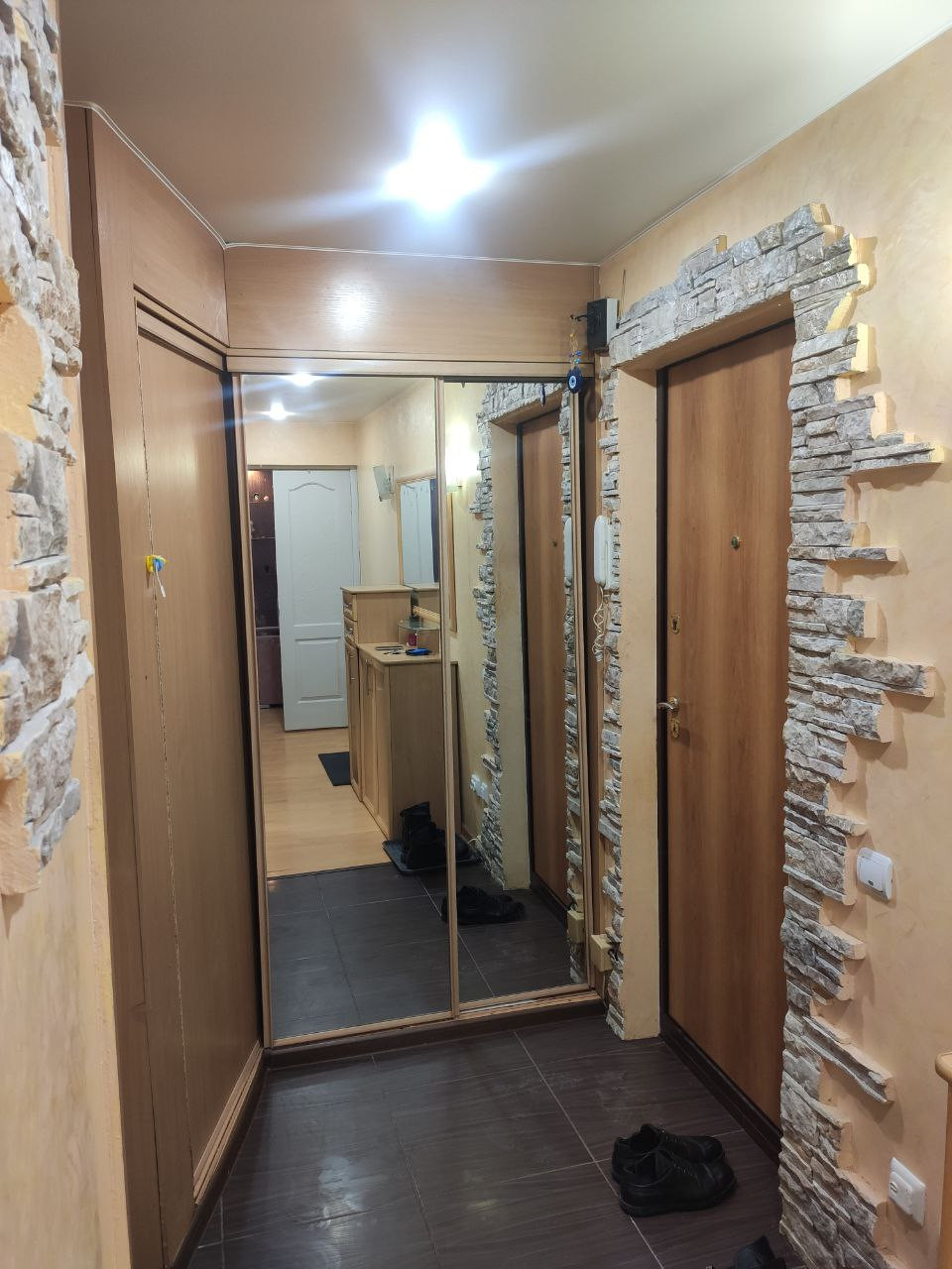 Квартира не в отличном, но в хорошем состоянии. Современная входная дверь. Гардеробная при входе. В прихожей и на кухне - тёплый пол.
