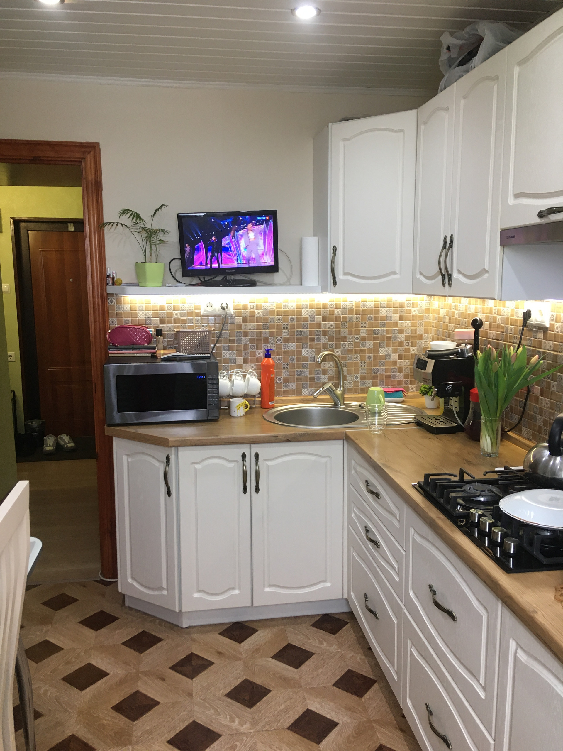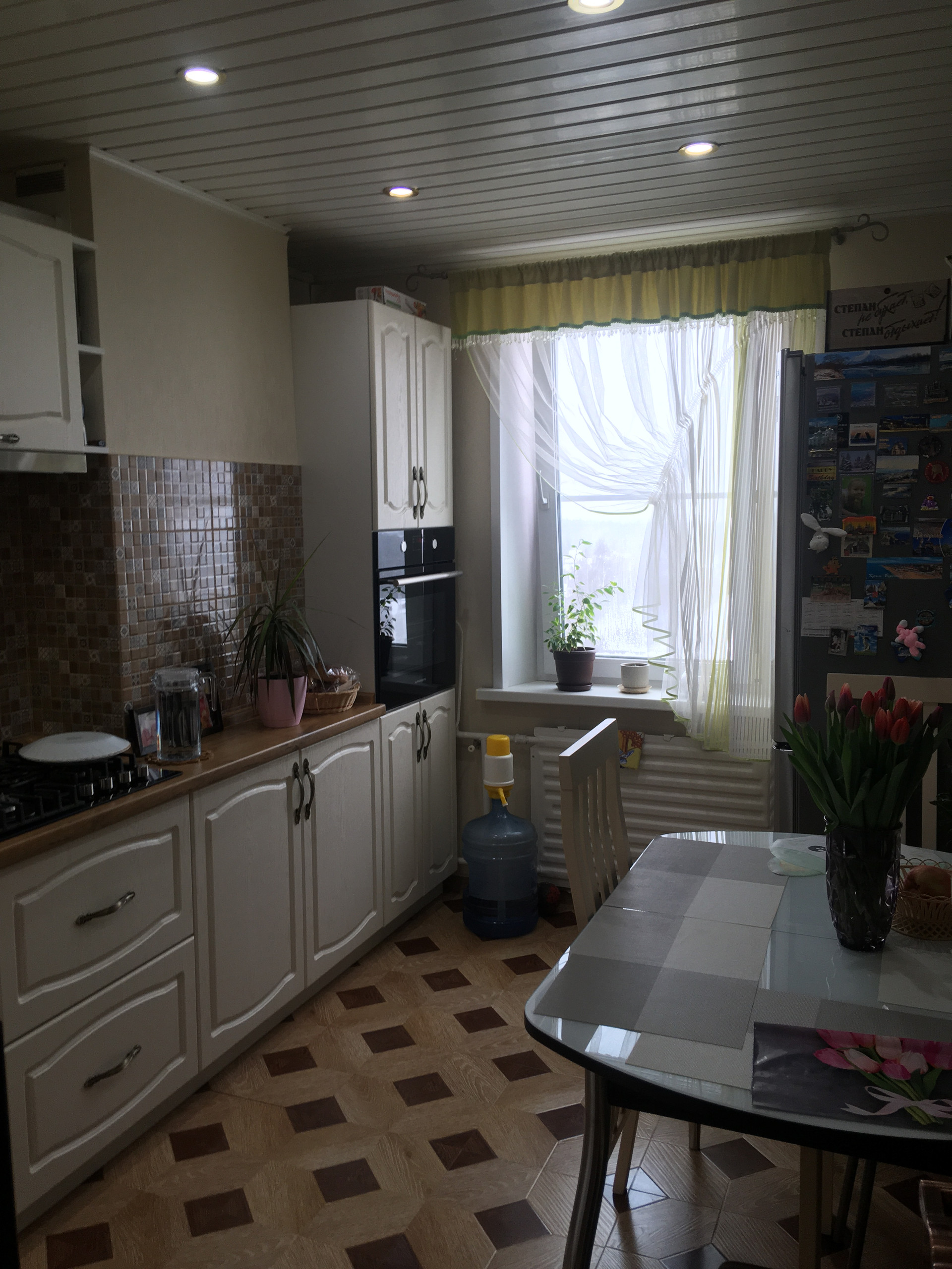 - большая квадратная кухня с качественным гарнитуром и встроенной техникой (духовой шкаф, варочная панель, вытяжка)
