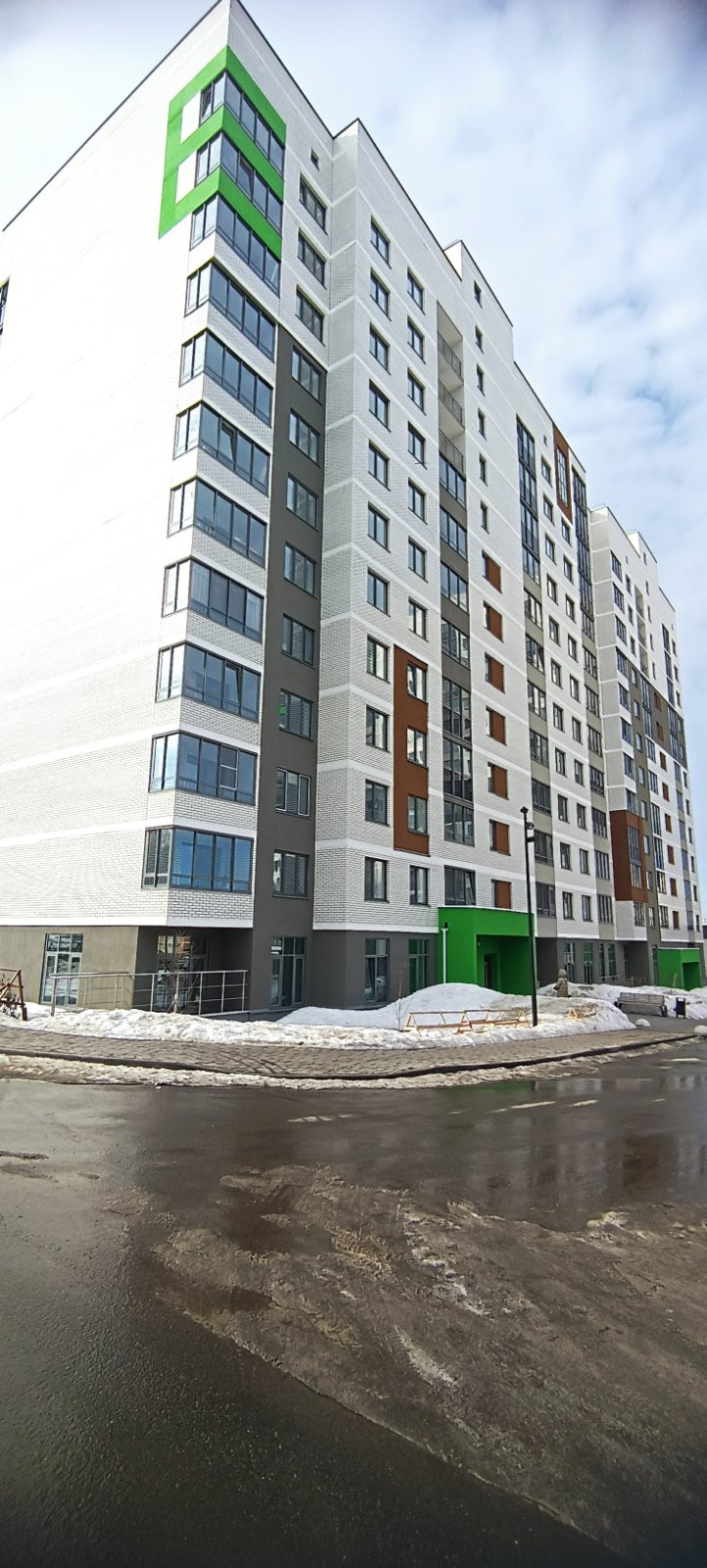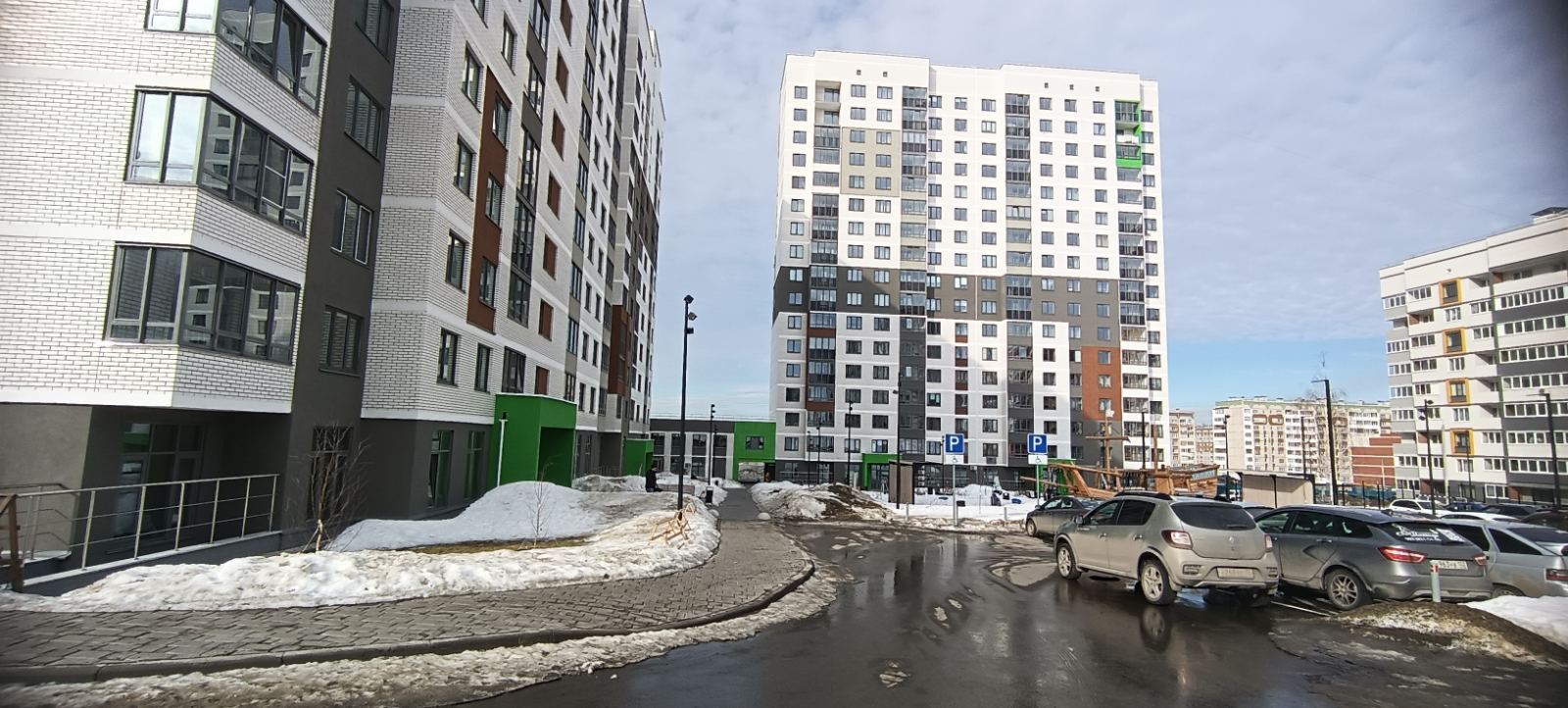 У дома большая детская площадка и закрытый двор со шлагбаумом.