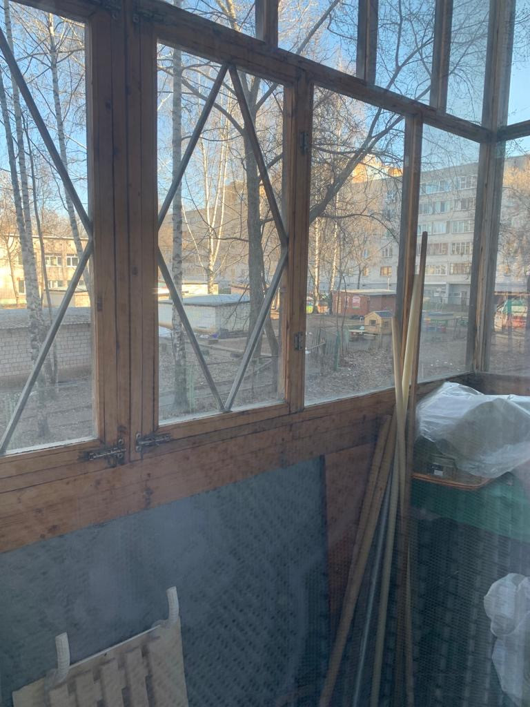 Окна смотрят на детский сад-зелёную зону.