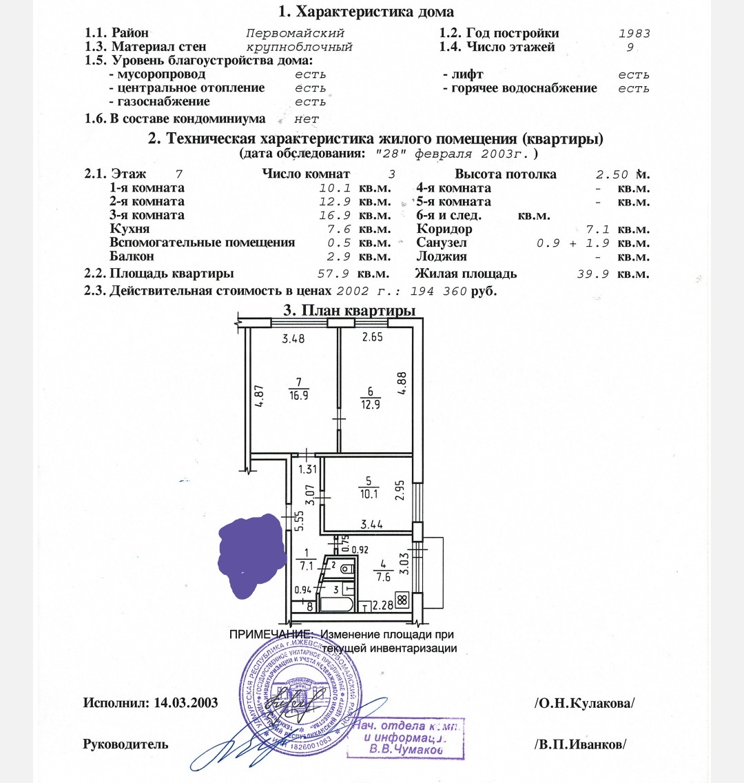 Продам просторную 3к.кв. площадью 57,9кв.м , расположенную на 7 этаже в девятиэтажном доме по адресу: ул. Воровского, д.125.