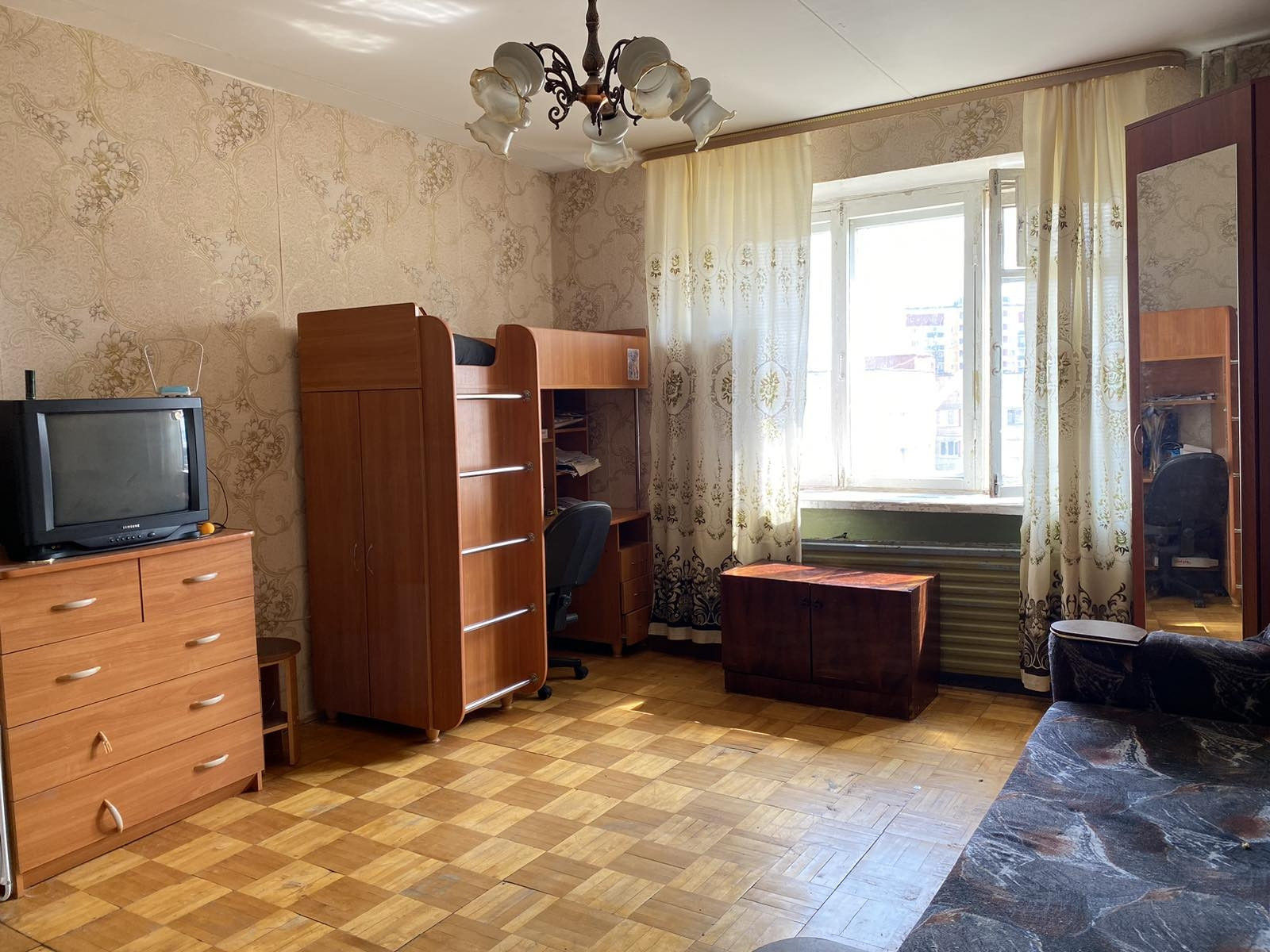 Квартира большая, светлая, но требует ремонта. Хороший вид их окна. Паркет на полу в комнате, застекленный балкон, пластиковые трубы. Остается кухонный гарнитур. В подъезде консьерж, новый лифт.