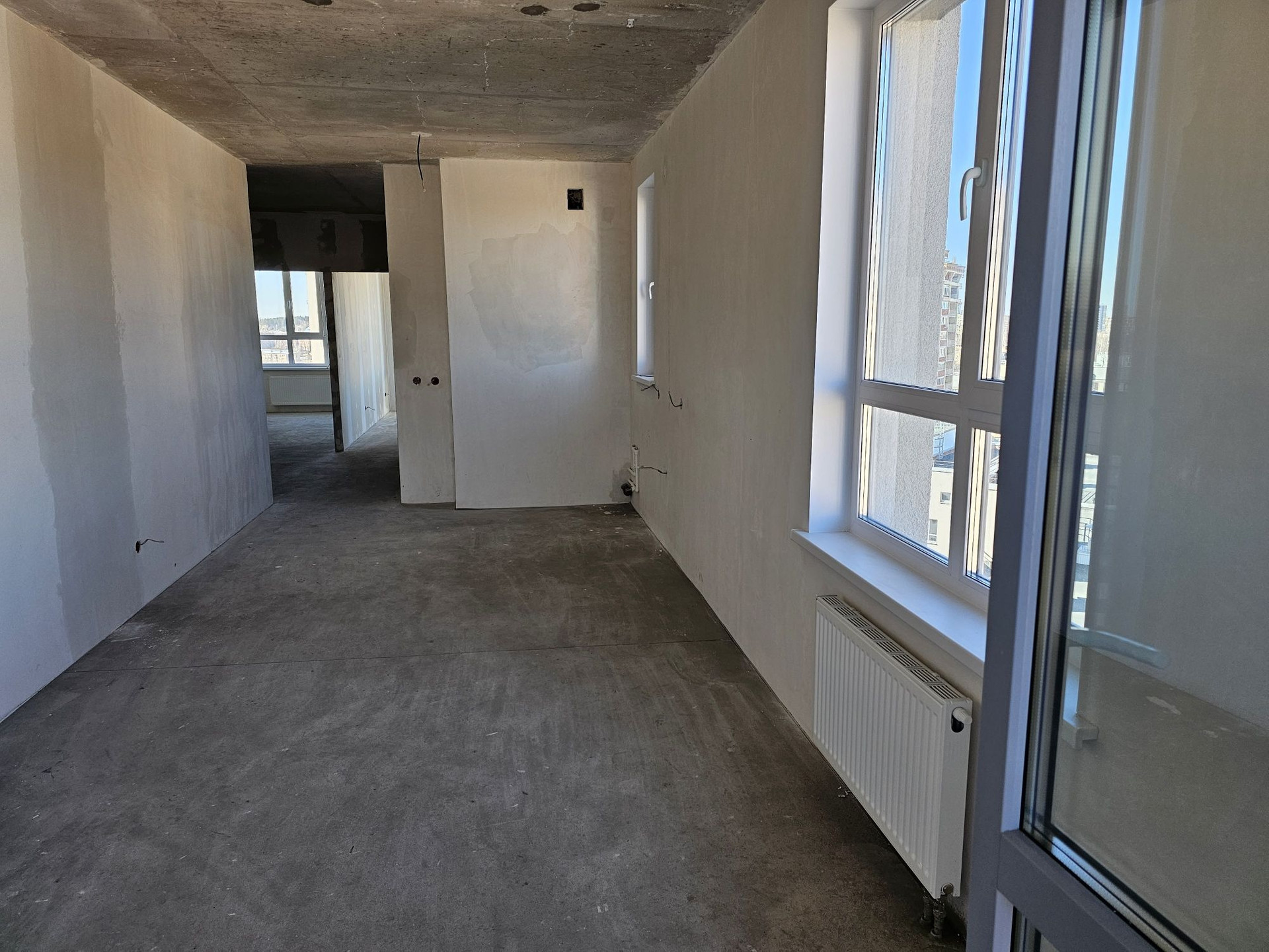 Очень светлая квартира ( 6 окон ) Формат 2 + Кухня-Гостинная и 2 отдельные спальные комнаты в другой части квартиры. Качественная предчистовая отделка, в доме своя котельная ( Хорошая экономия на платежах и всегда горячая вода )