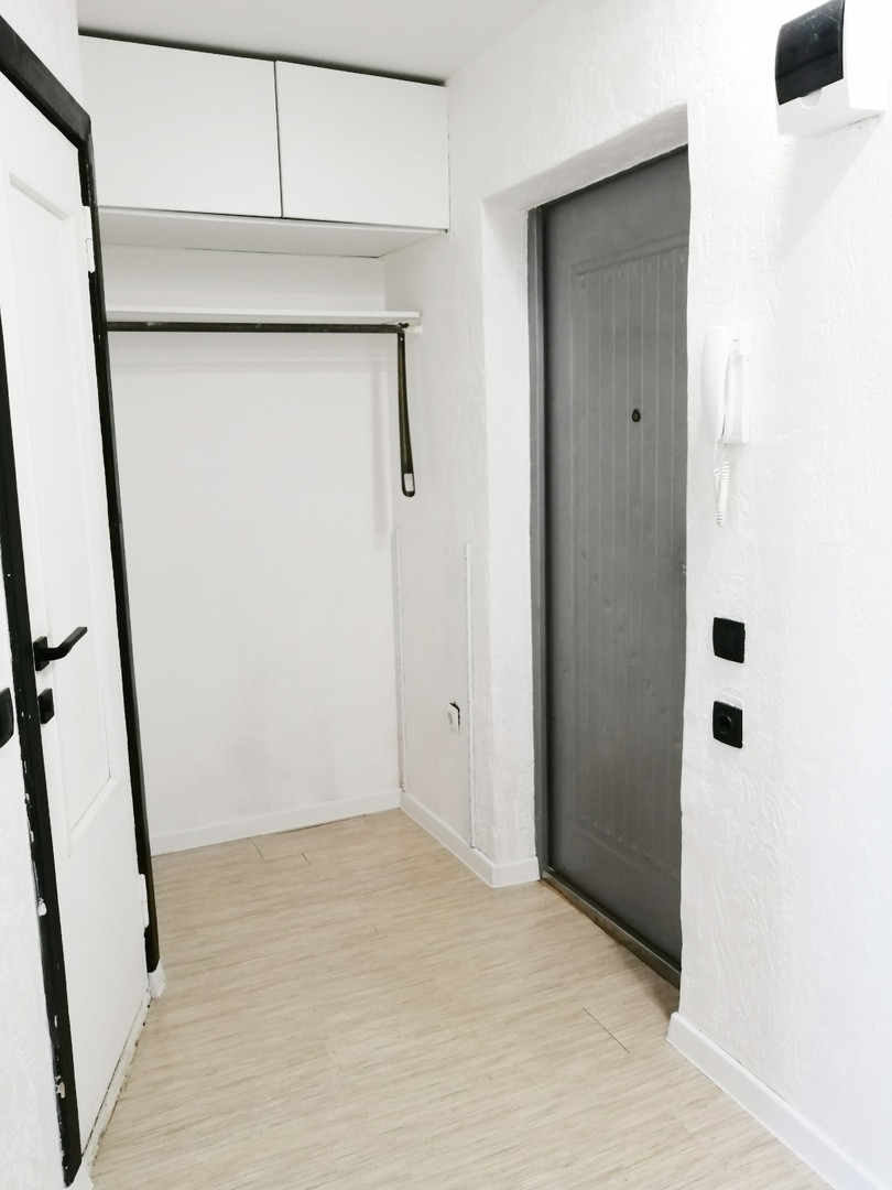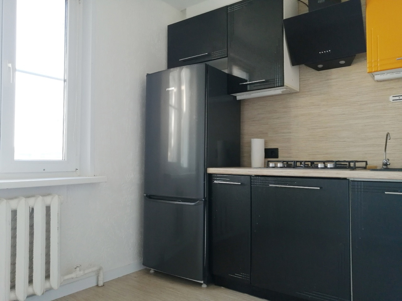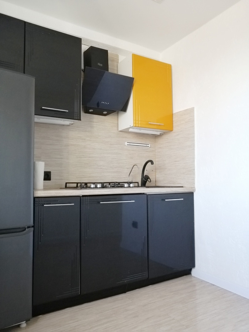 -Остается кухонный гарнитур с варочной панелью и вытяжкой, холодильник и очень вместительный шкаф)