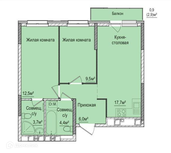 Общая площадь 54 м2