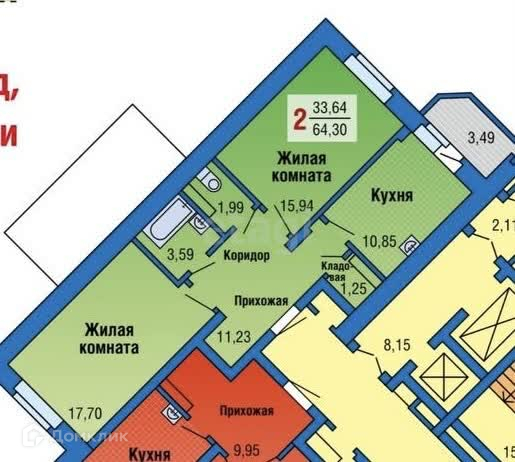 Площадь 62.9+3.49 балкон.