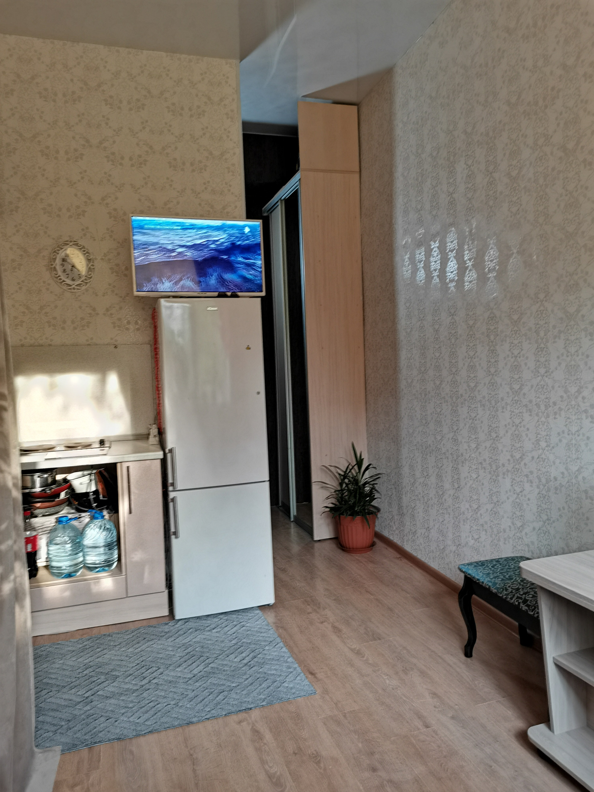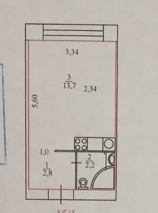 Студия расположена в общежитии, но есть свой санузел, душевая, кухня, все сделано изначально и узаконено в планировке.