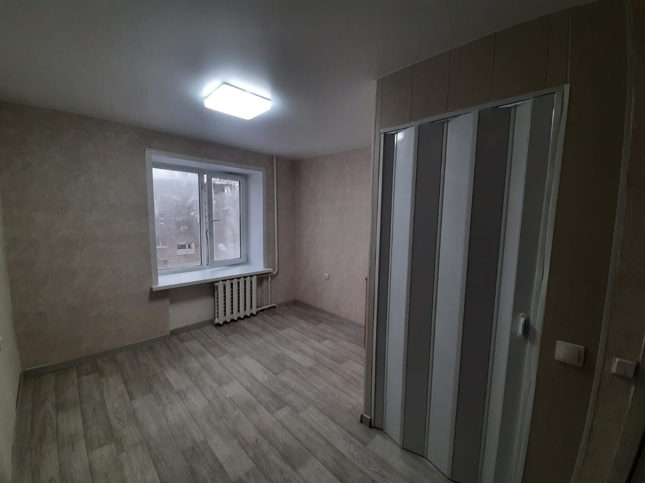 — Натяжной потолок по всей комнате с новой диодной люстрой.