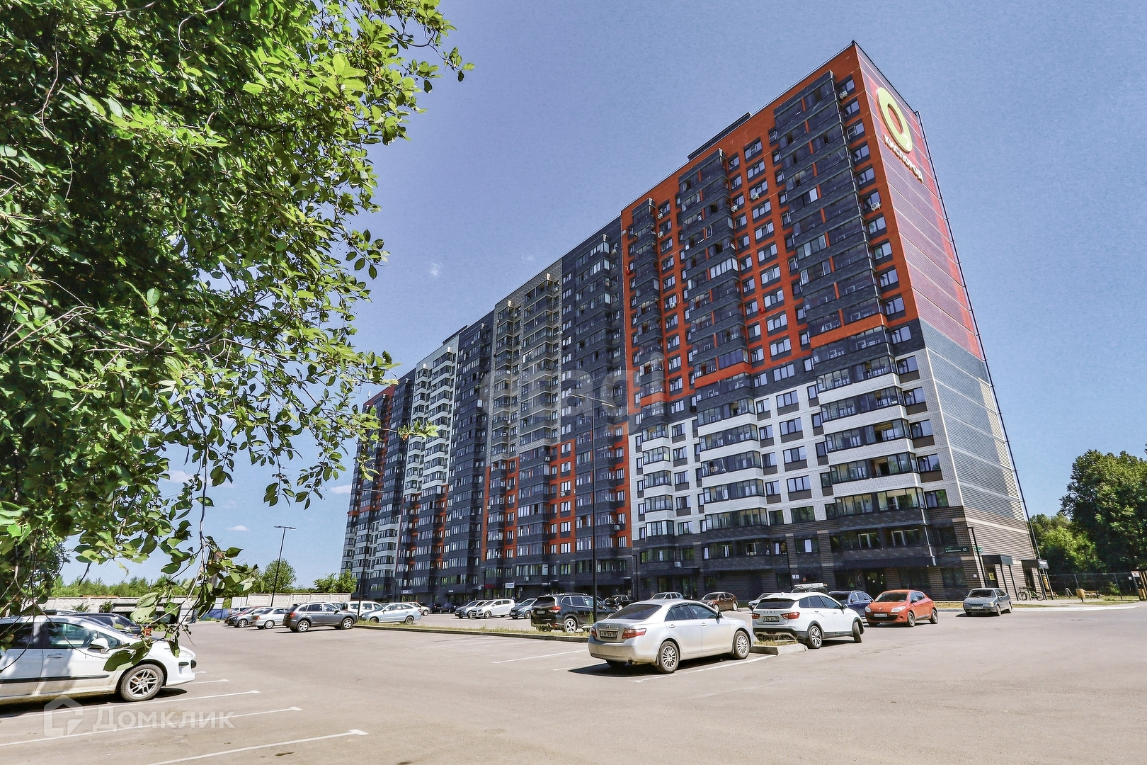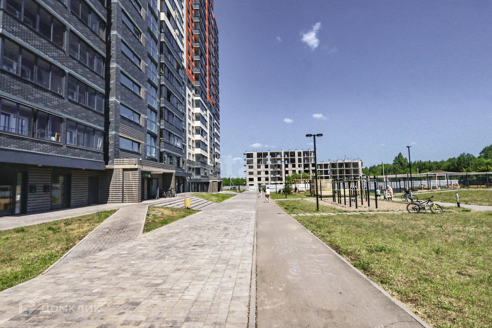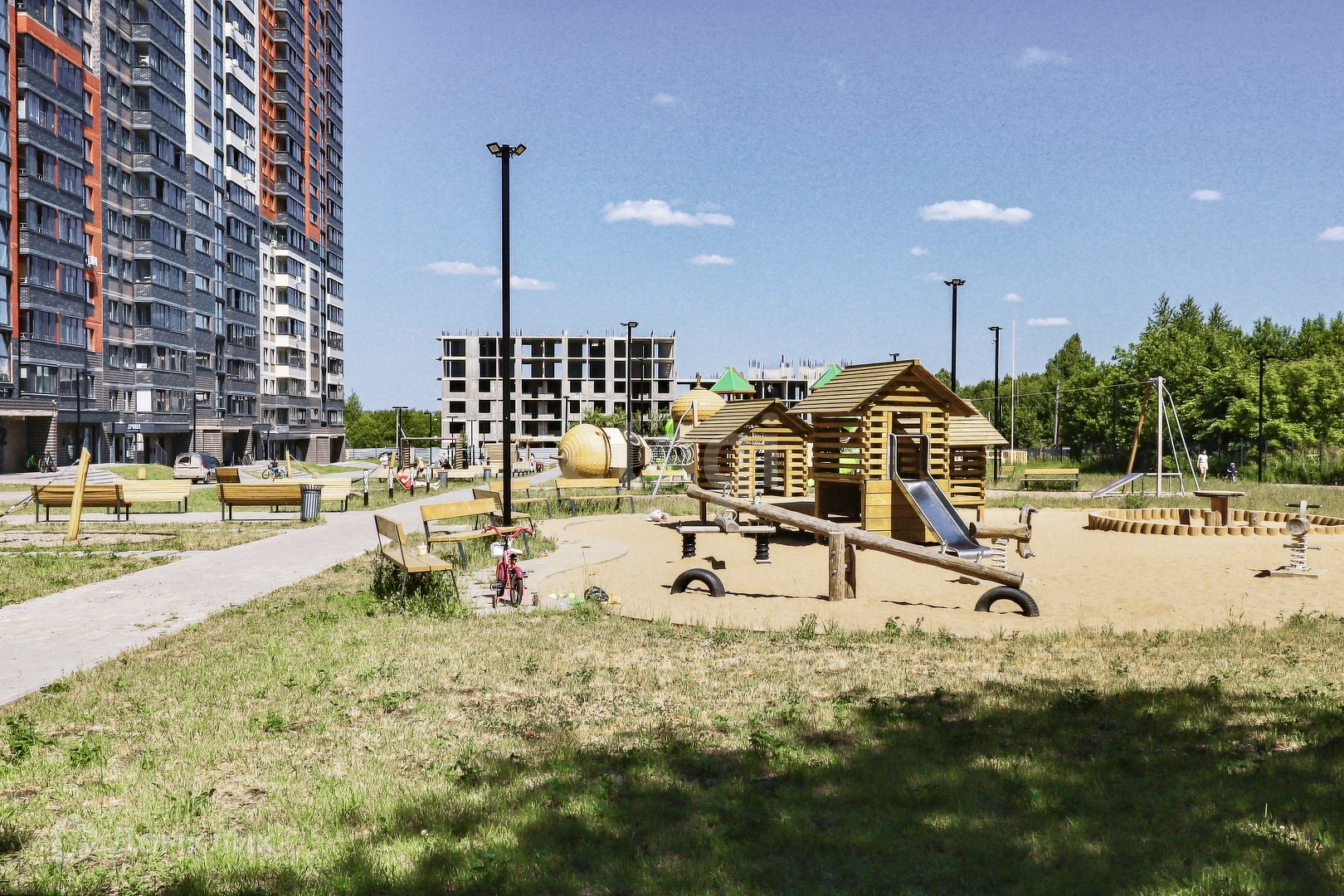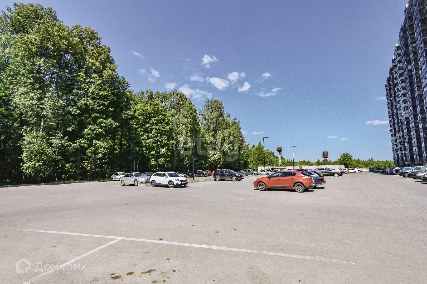 Огромная парковочная площадка для машин, придомовая территория огорожена, просторные детские площадки, пешеходные дорожки