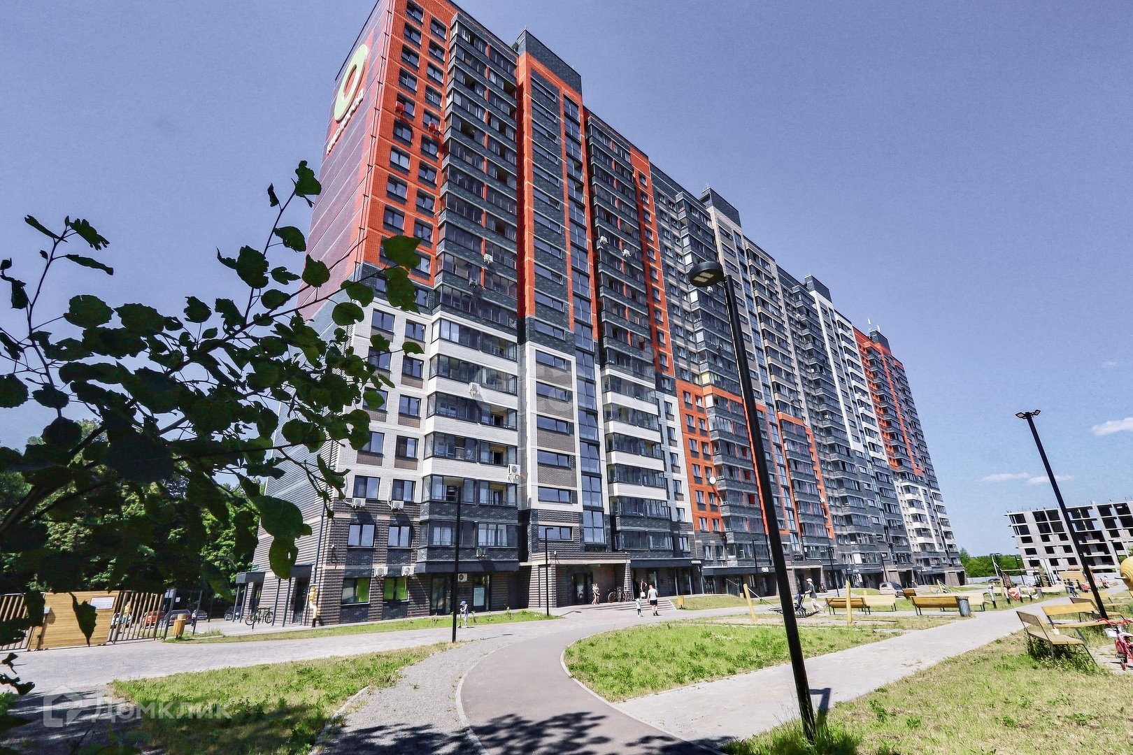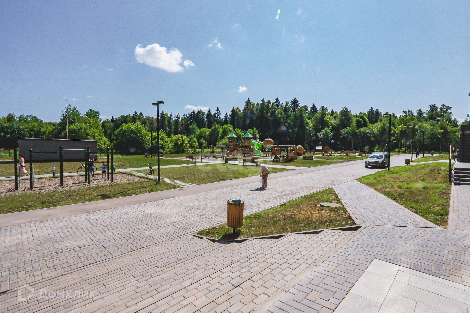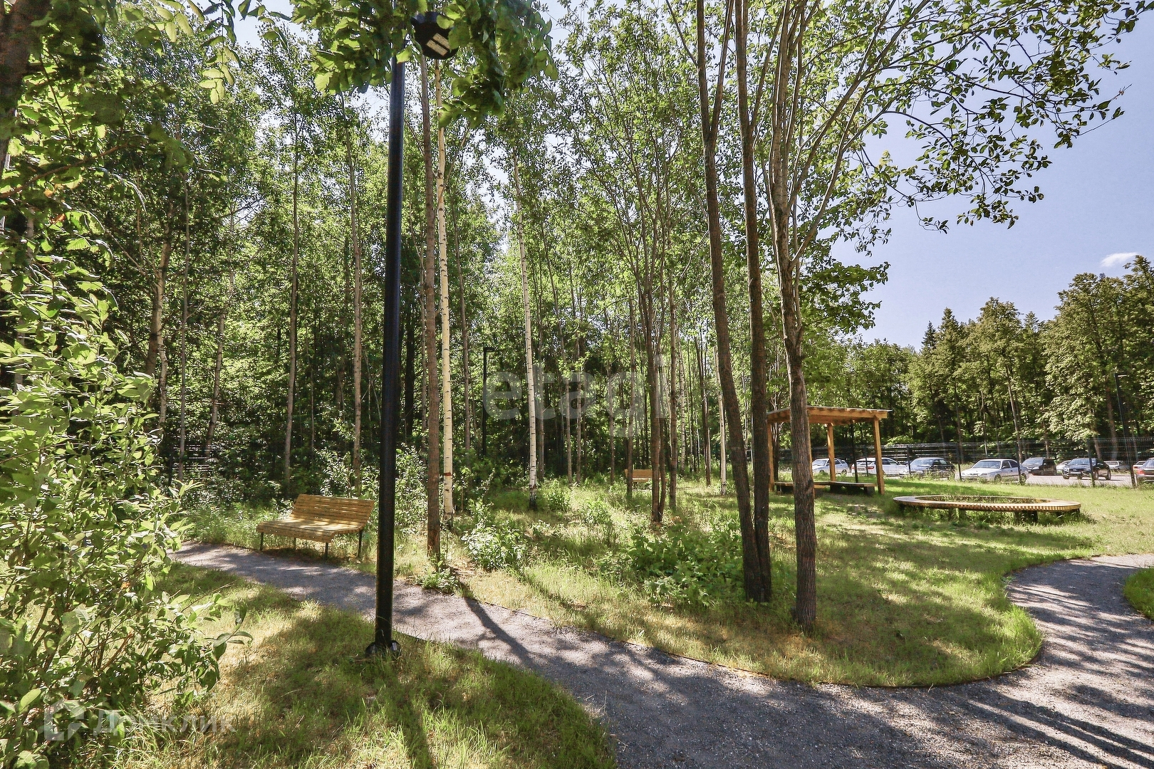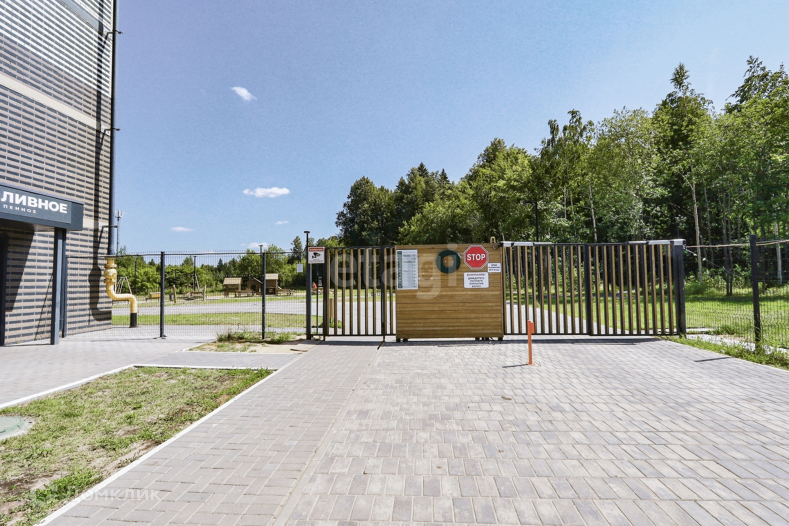 Огромная парковочная площадка для машин, придомовая территория огорожена, просторные детские площадки, пешеходные дорожки