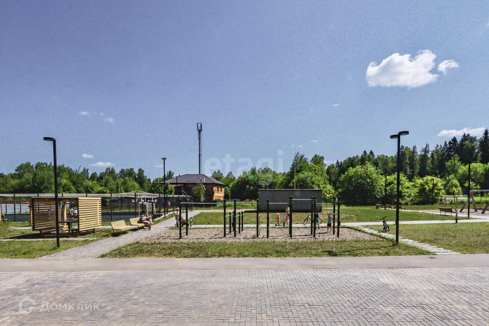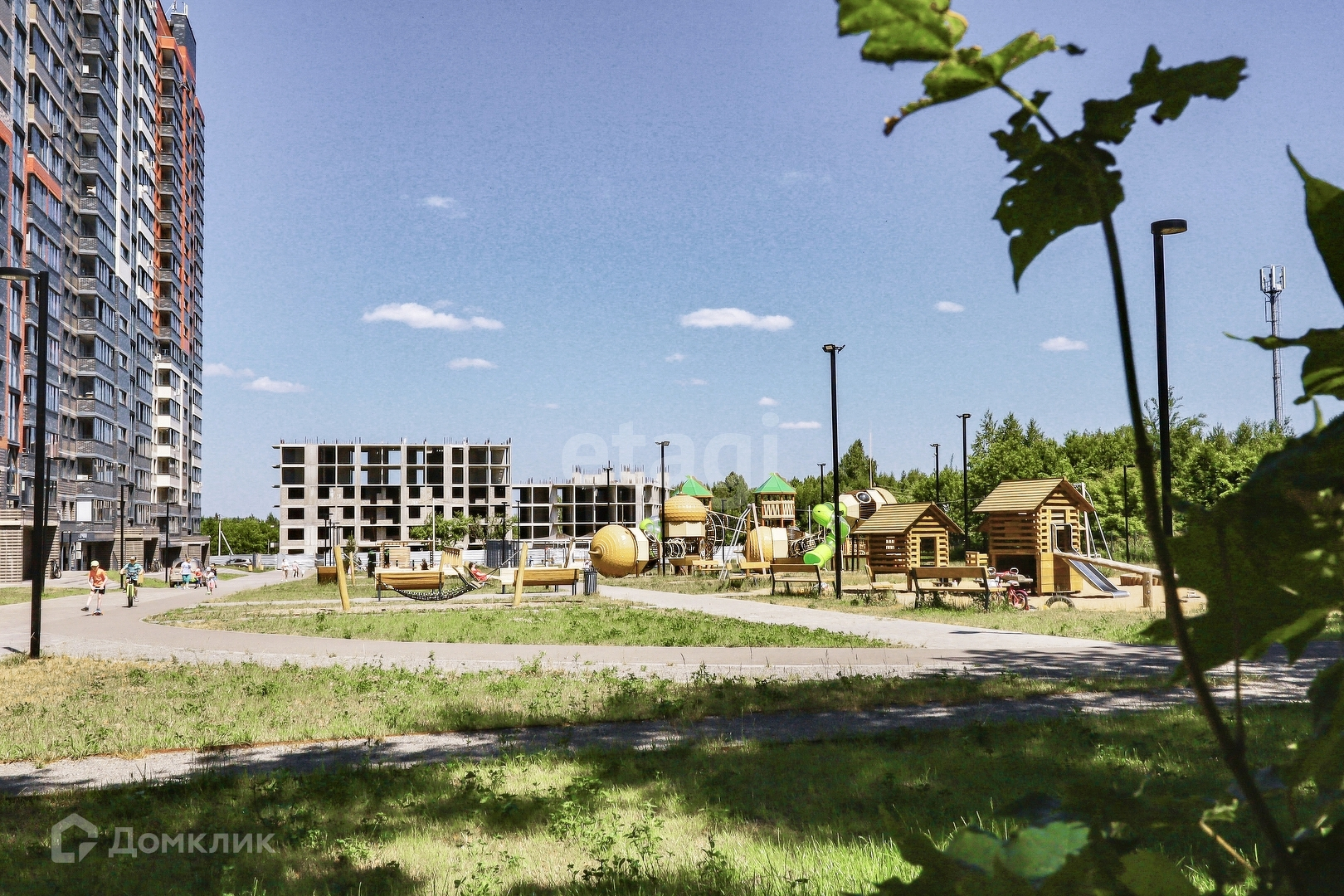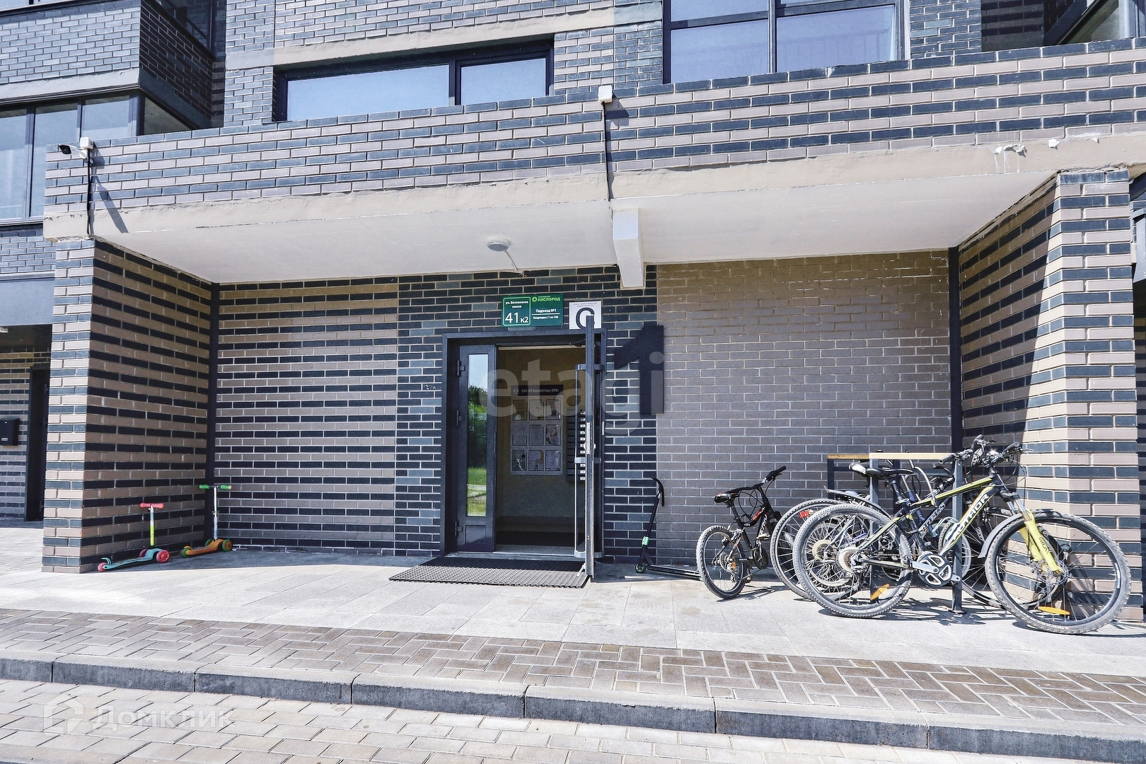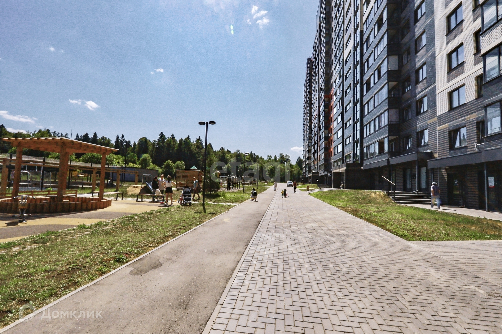 Огромная парковочная площадка для машин, придомовая территория огорожена, просторные детские площадки, пешеходные дорожки