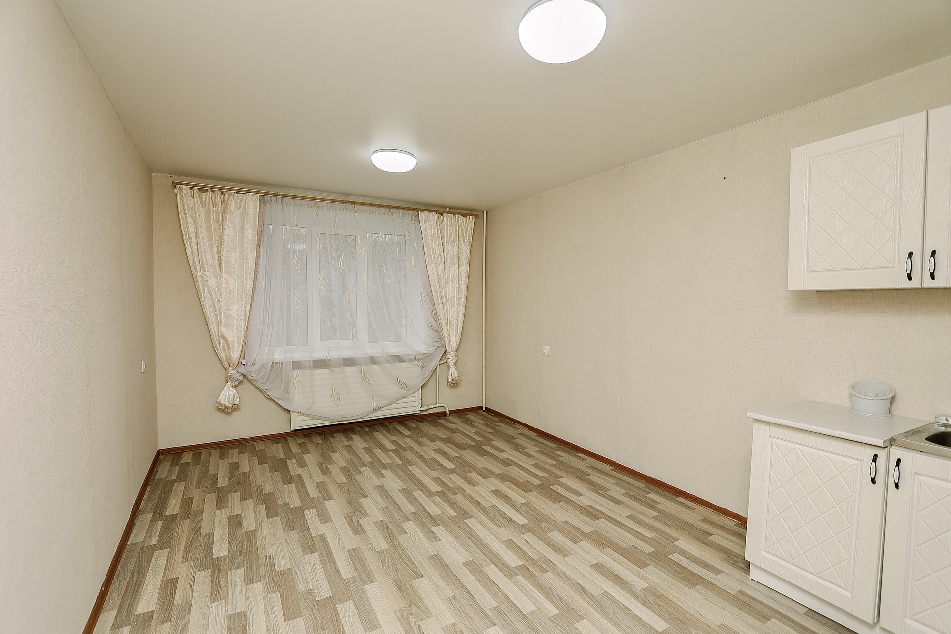 - Квартира-студия представляет собой большую комнату с кухонной зоной и совмещённым санузлом.