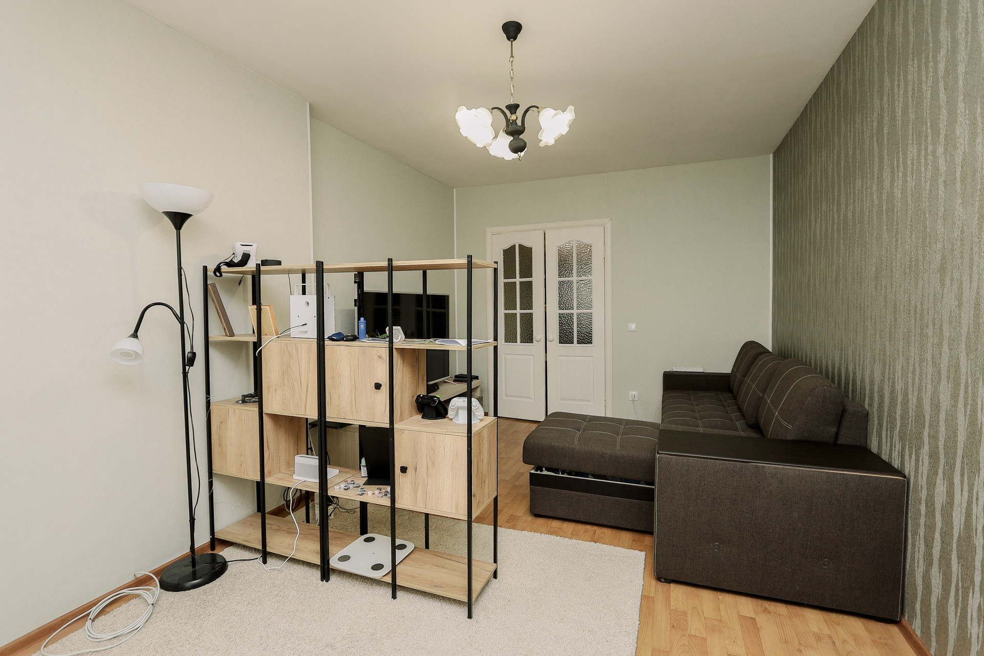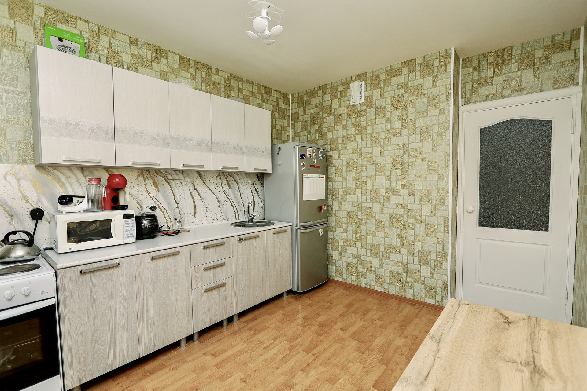 В квартире остаются: кухонный гарнитур, электроплита, стенка и шкаф в коридоре, диван.
