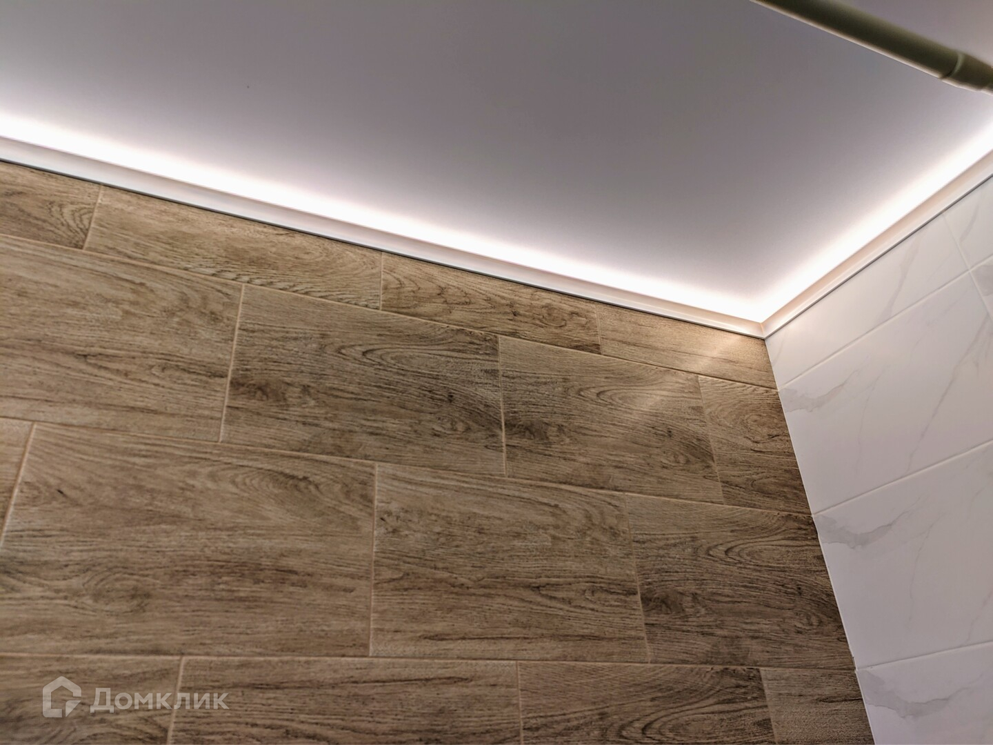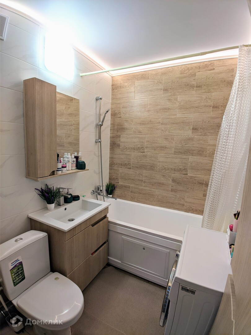 - В квартире два санузла. В первом санузле установлен унитаз и раковина. В ванной сделан дорогой, качественный ремонт, уложен керамогранит, натяжной потолок с подсветкой. Мебель в ванной комнате остается.