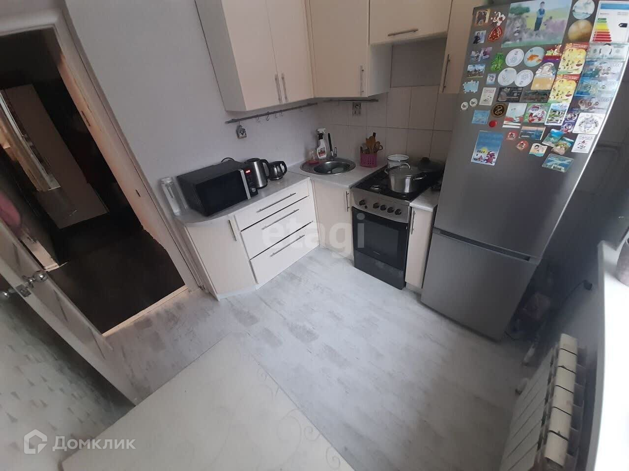 На полу - постелен ламинат, в санузле - уложена плитка,из мебели остается кухонный гарнитур.