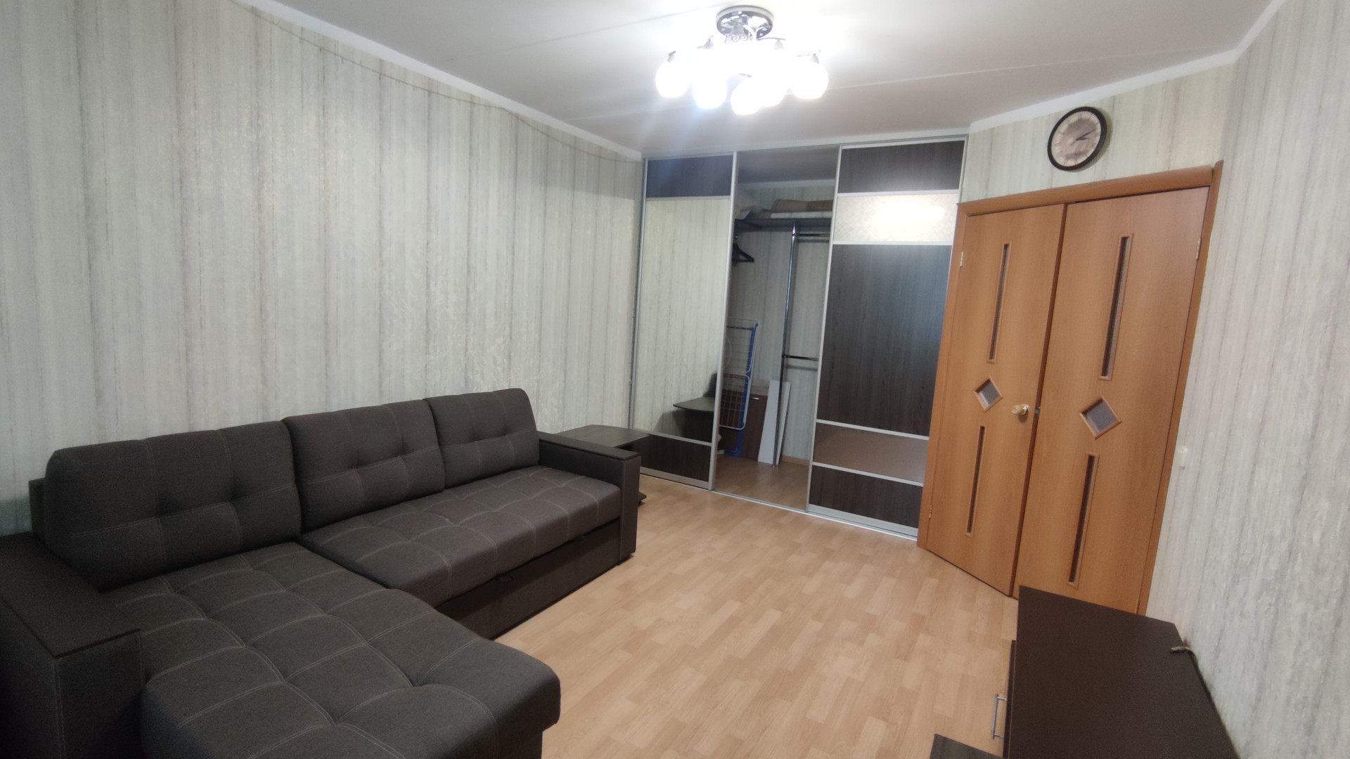 В квартире просторная комнта  диваном, гардеробом и лоджией.