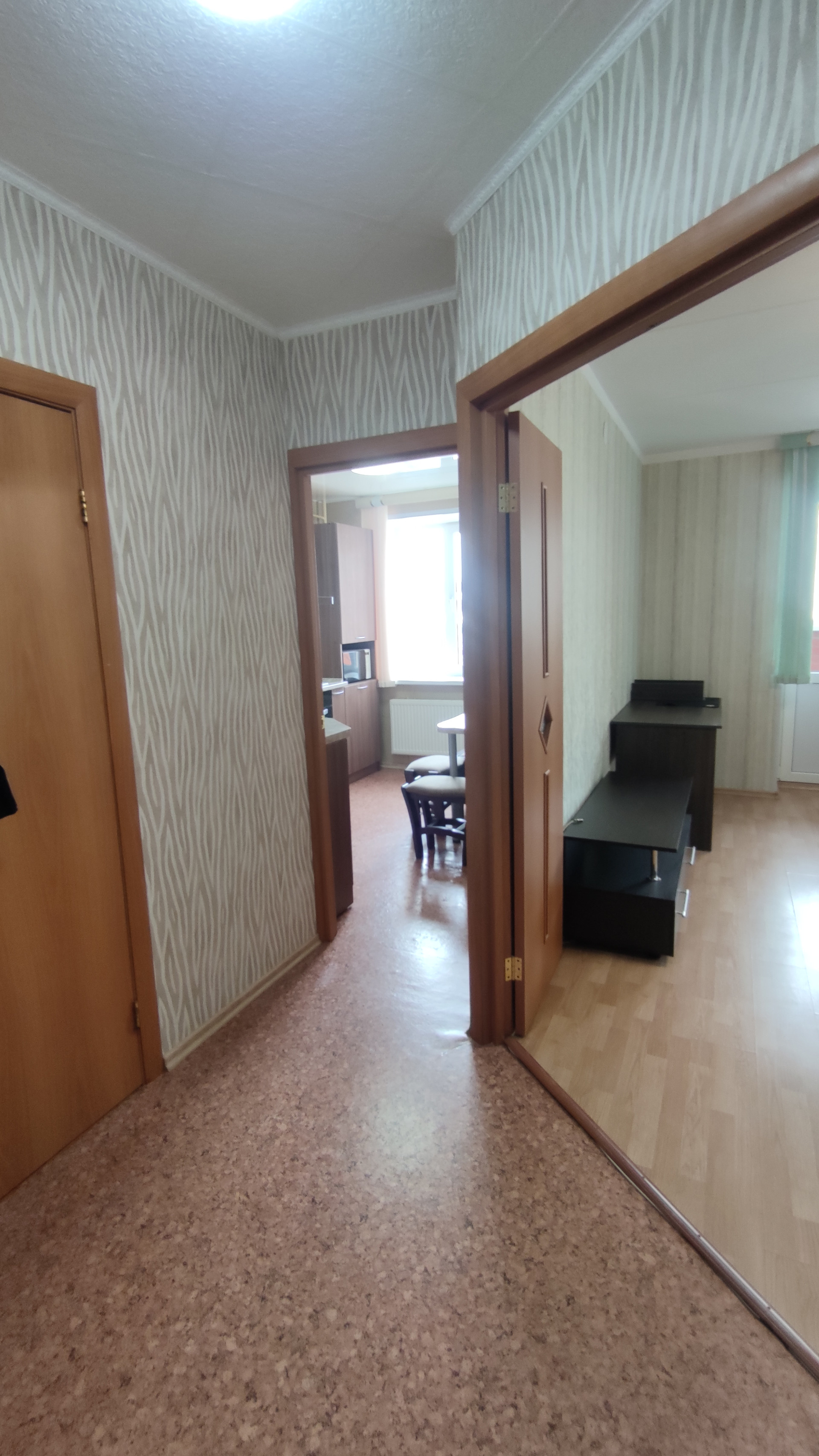 Прихожая достаточно просторная и разделяет собой кухню, комнату и санузел.