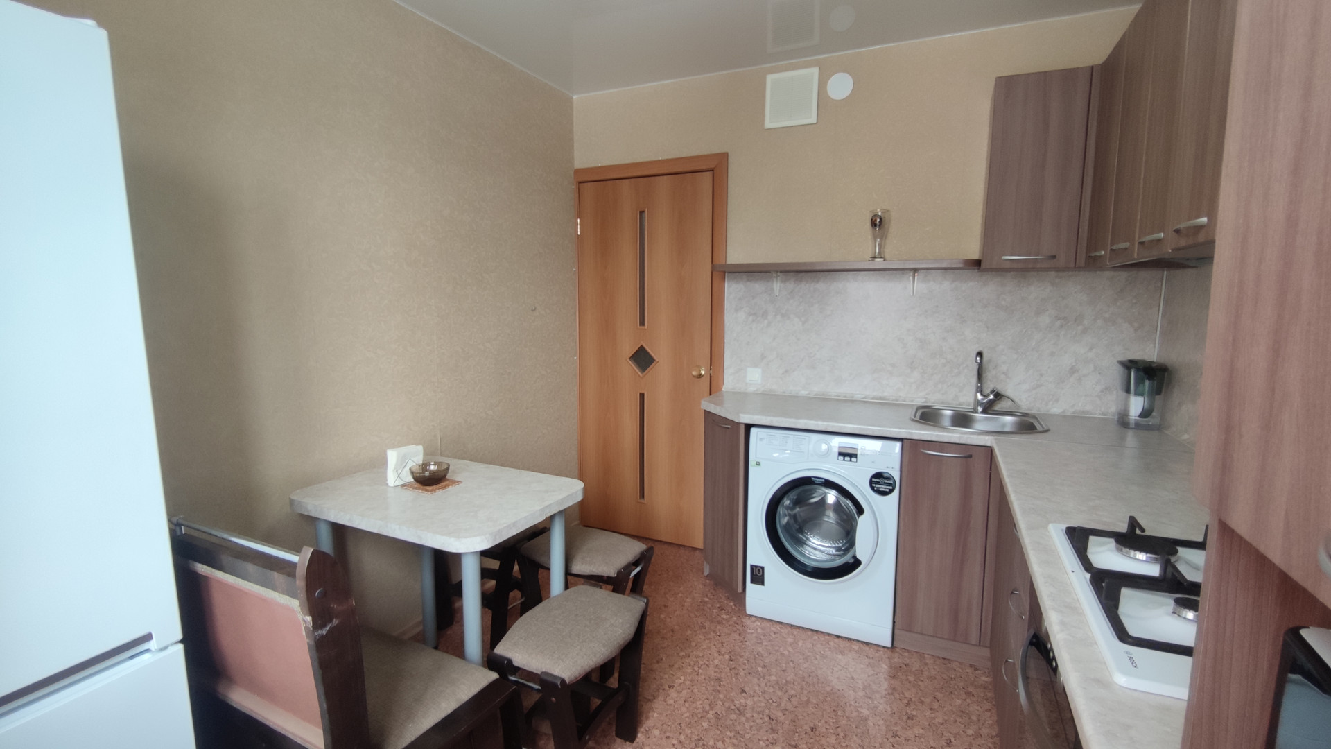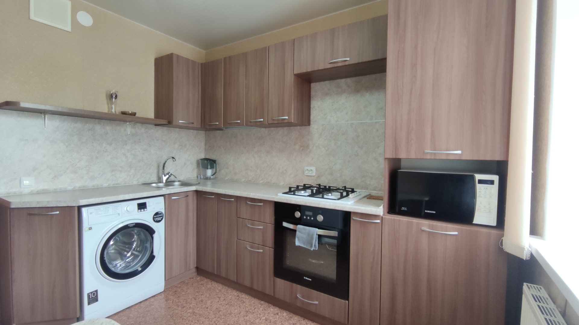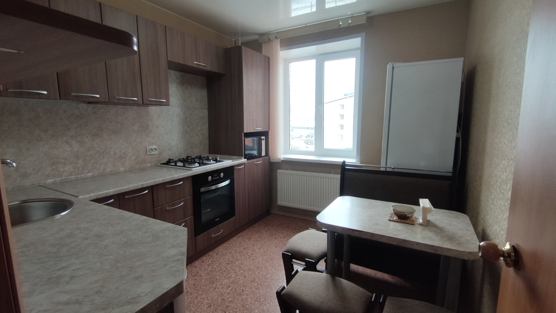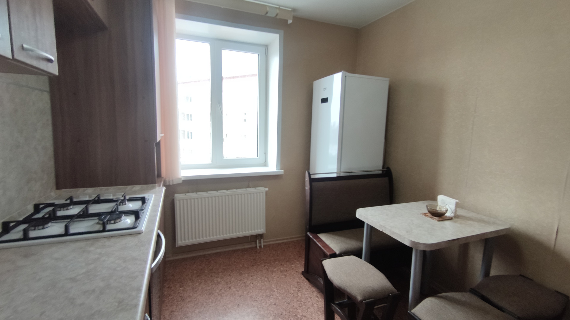В квартире современная кухня выполненная в тонах под дерево, газовая плита, а так же экономичный и эффективный радиатор (Такой же есть и в основной комнате).
