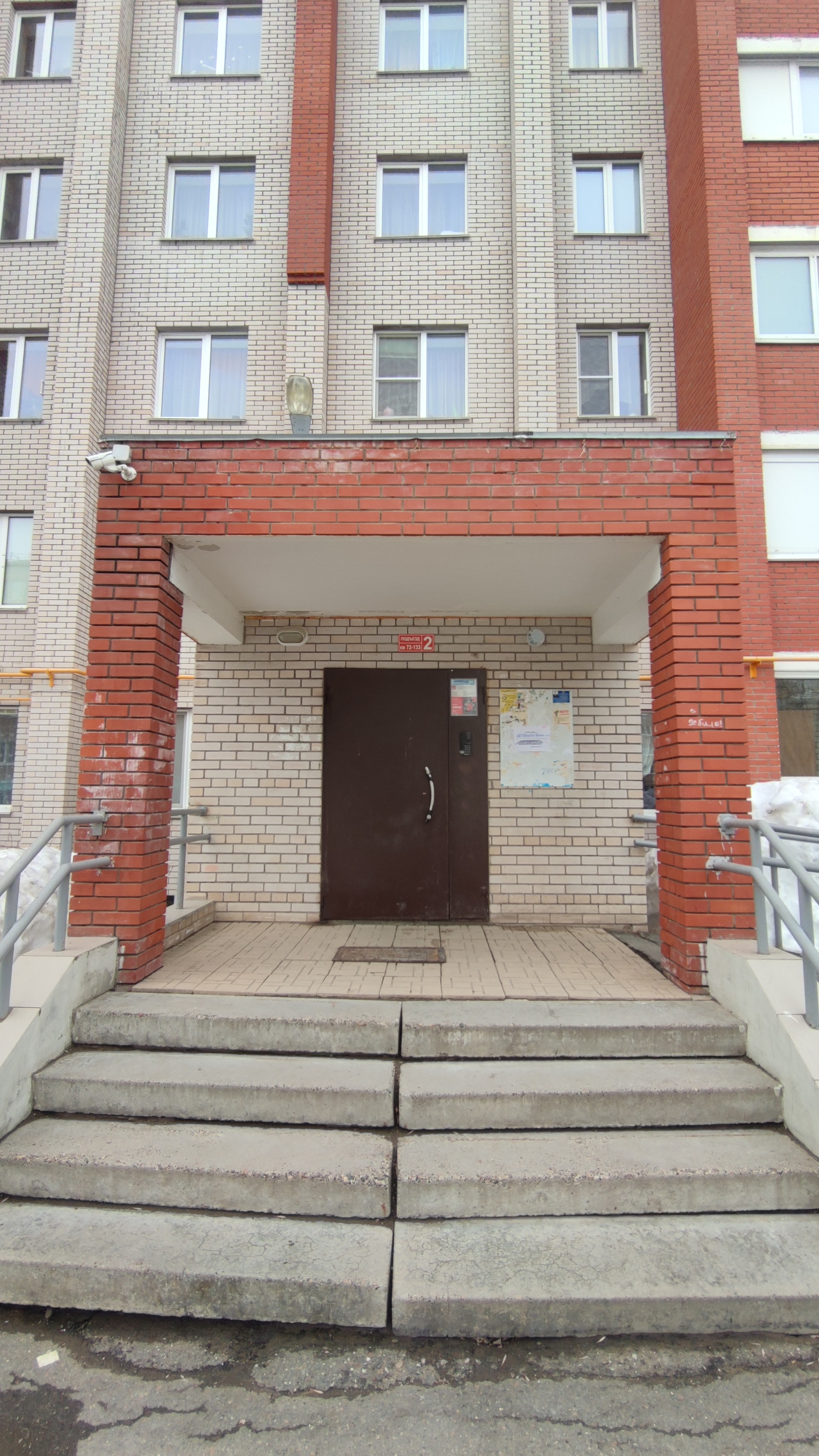 Вход в дом имеет большой кирпичный козырек, а так же бетонный пандус с поручнями.