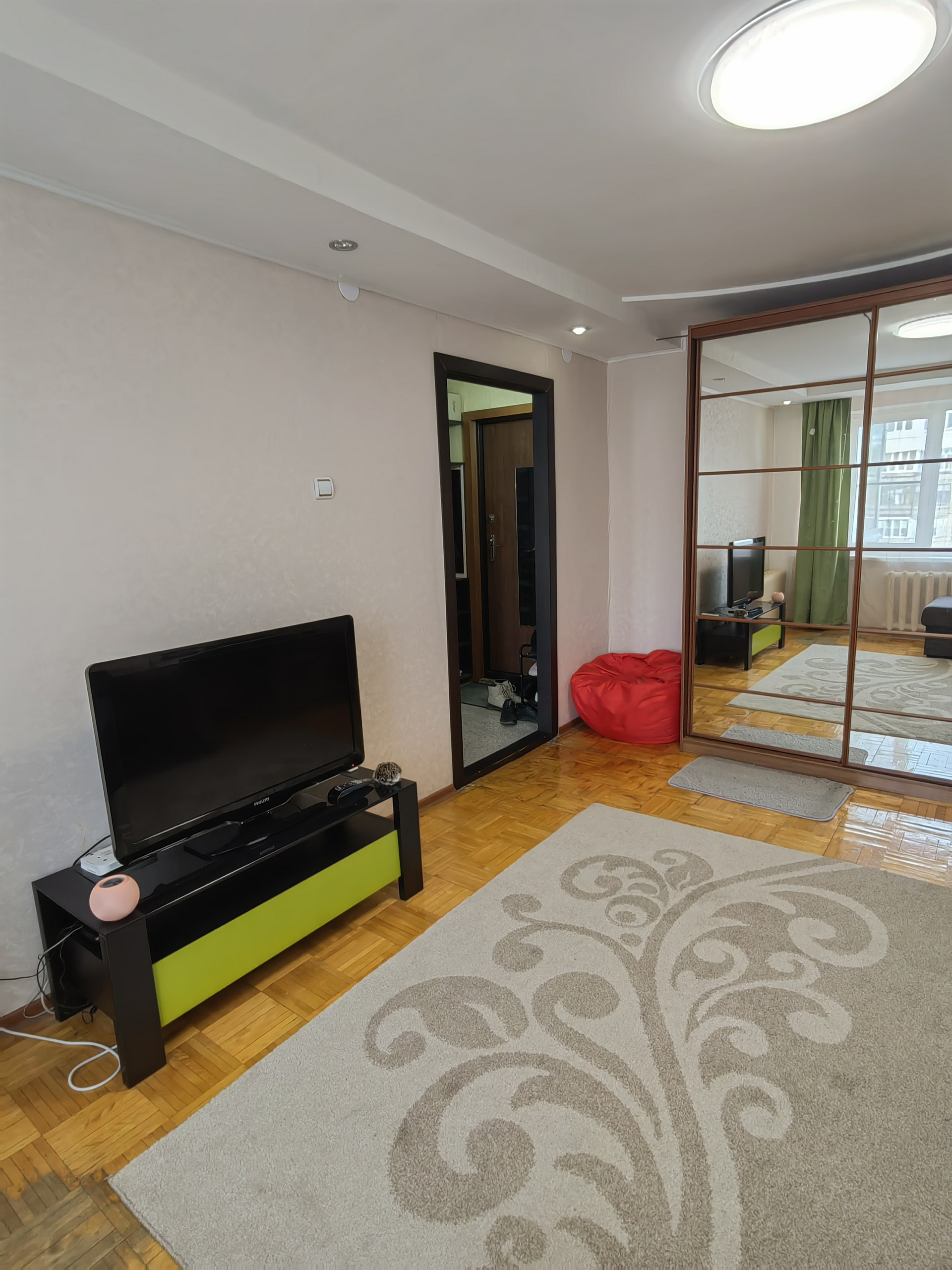 Оставляем кухонный гарнитур, обеденный стол, шкаф в комнате и шкаф в коридаре.