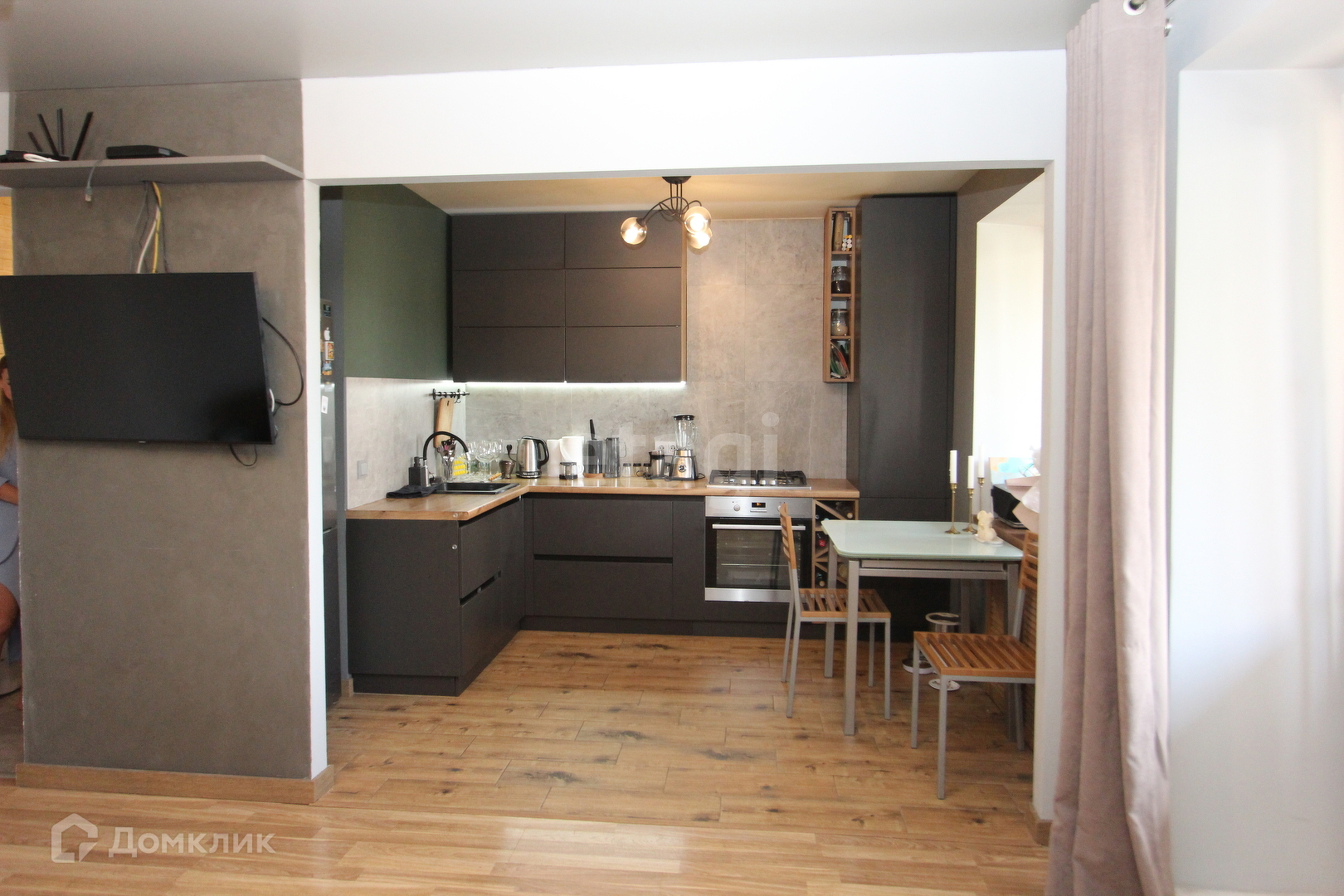 В квартире остается кухонный гарнитур, встроенный шкаф купе, кондиционер.