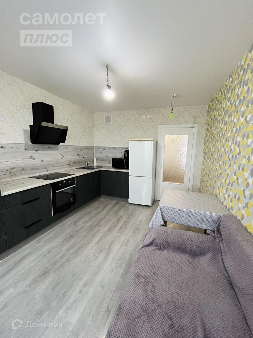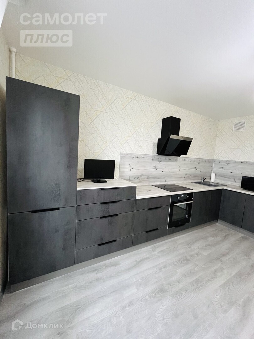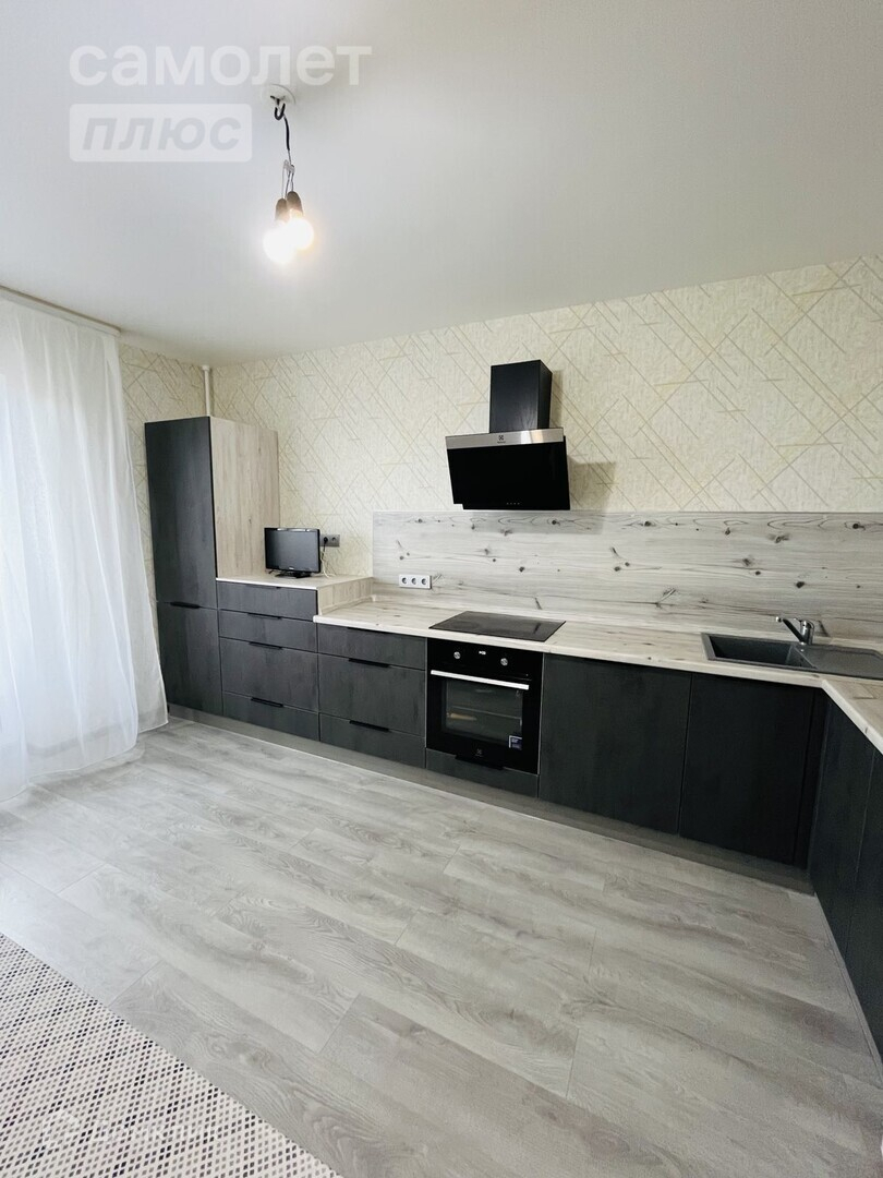Кухня: Современный кухонный гарнитур, встроенная бытовая техника (духовой шкаф, варочная панель, вытяжка, большая посудомоечная машина), диван.