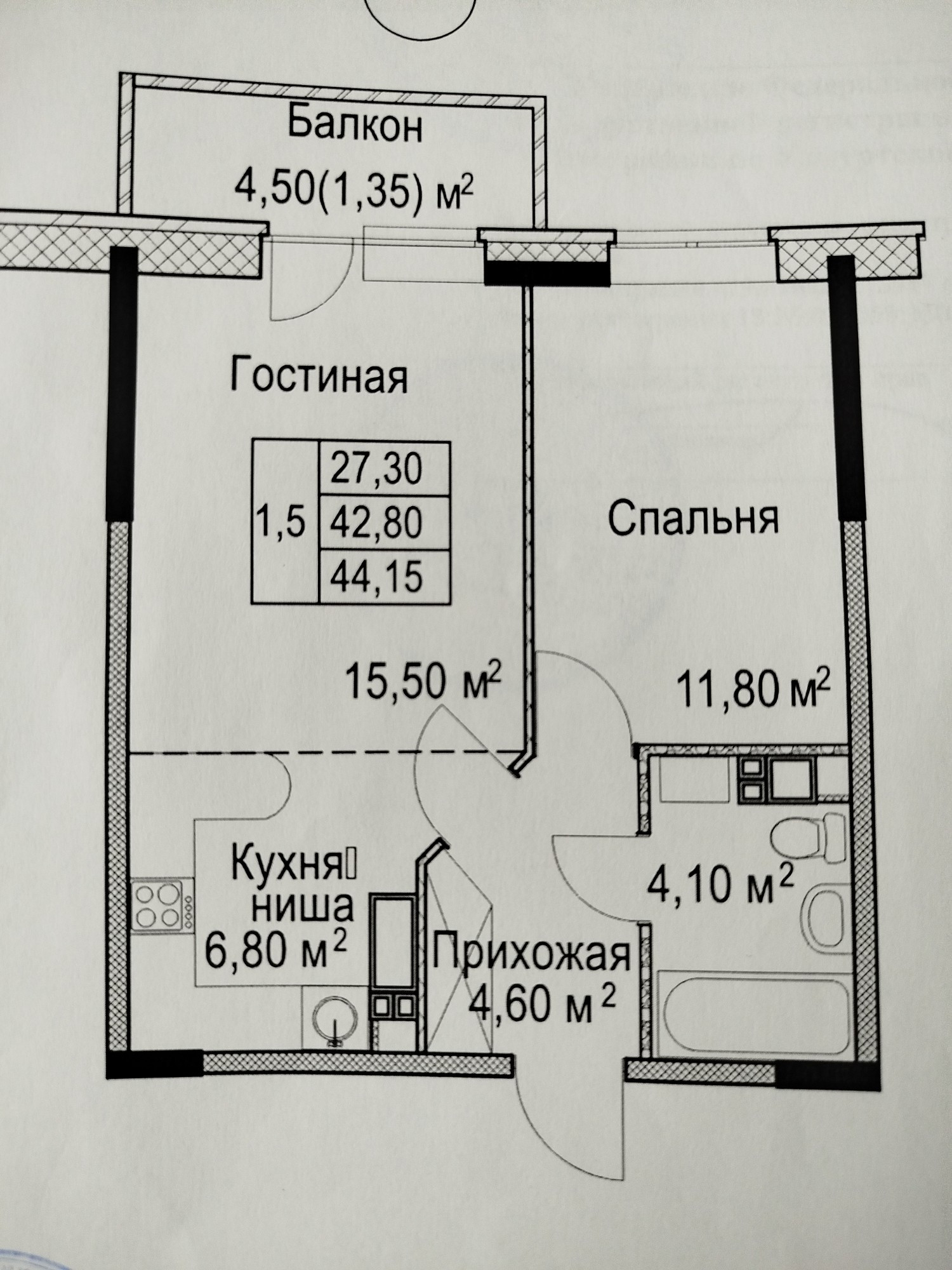 Общая площадь 42.9 м2