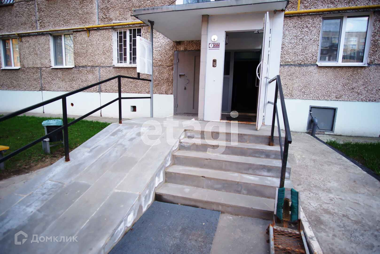 Первый этаж высокий. Пандус. Подъезд чистый.