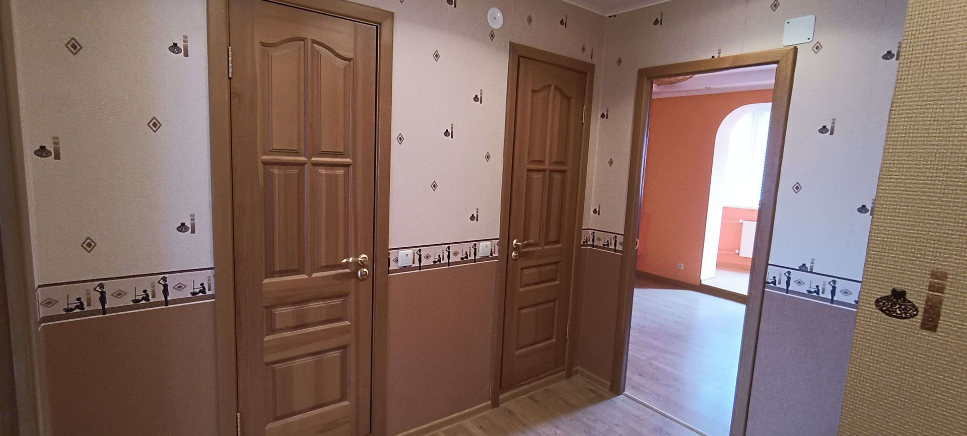 Пол ламинат, на кухне керамогранит.