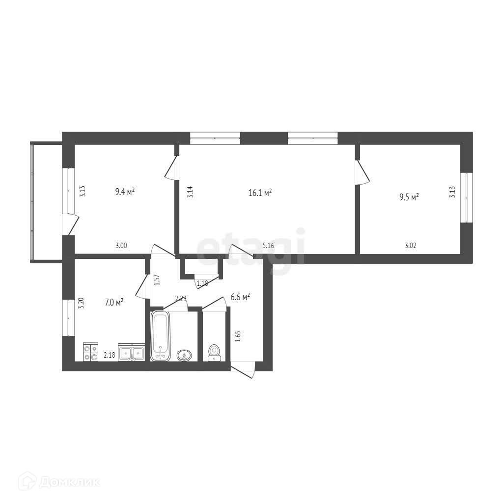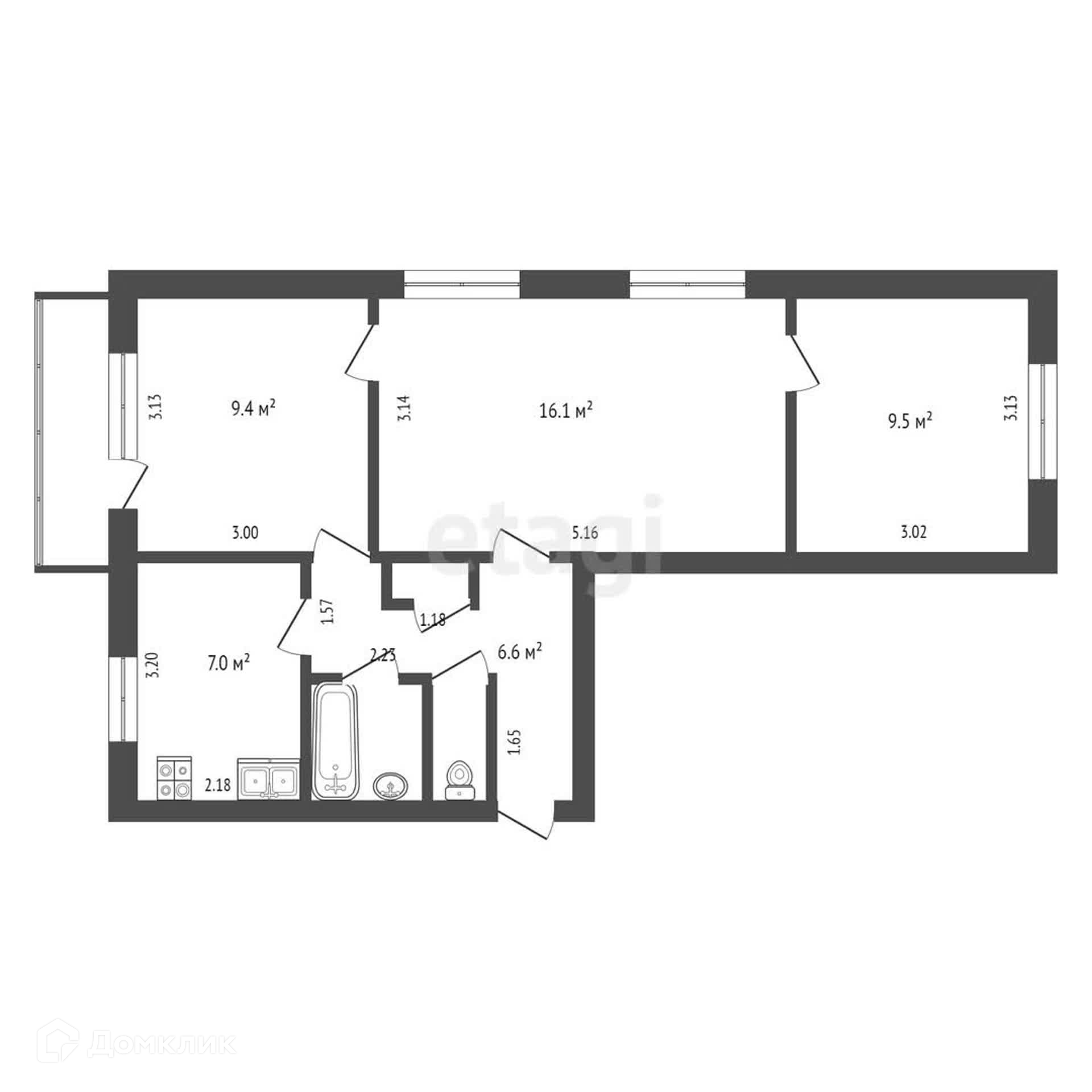 Общая площадь 52.6 м2