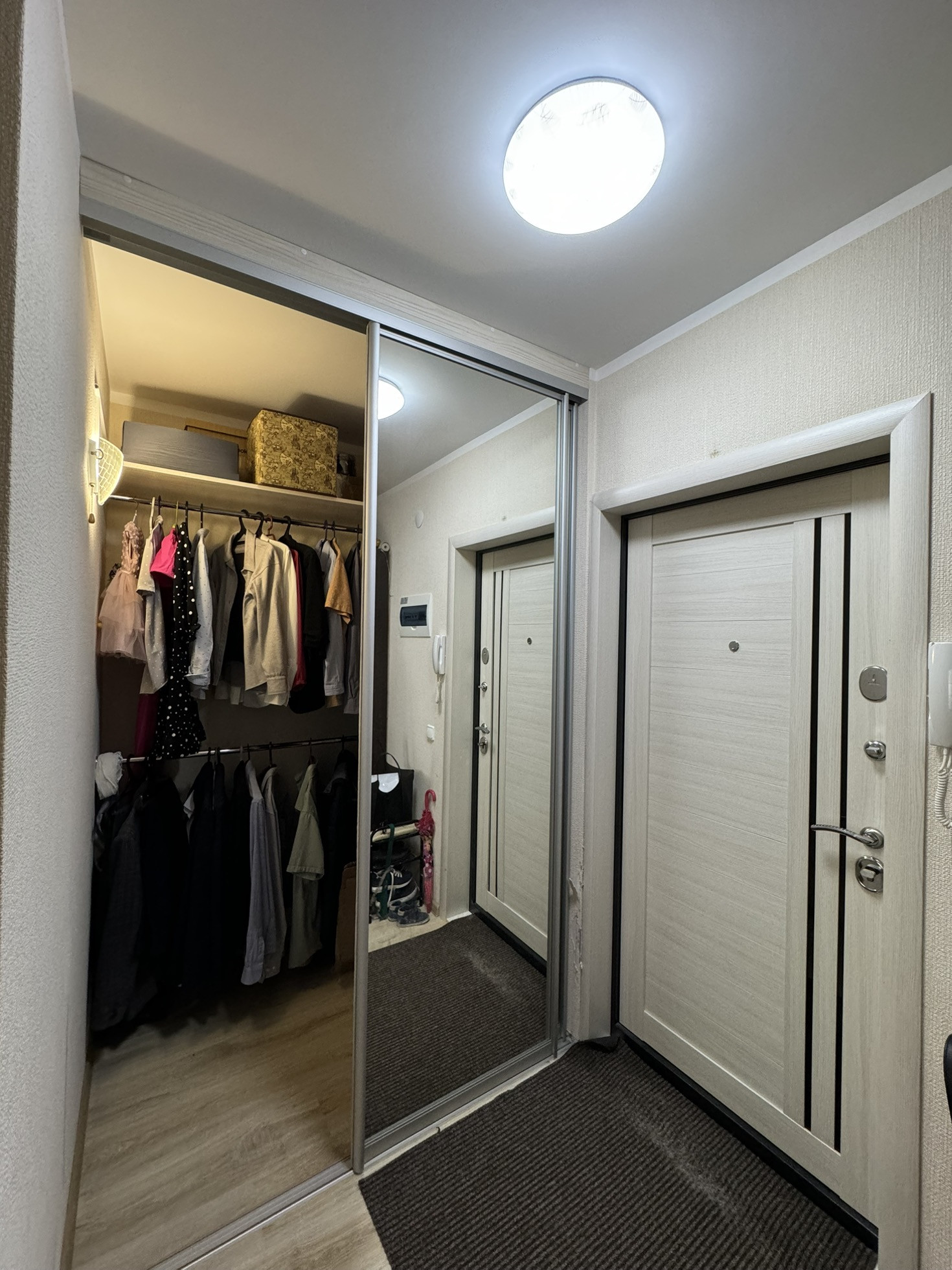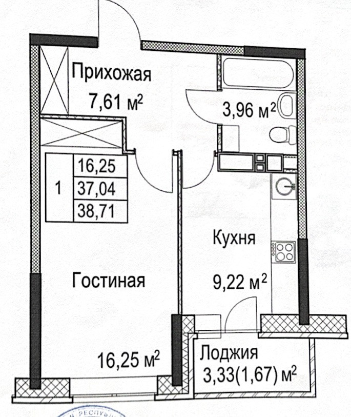 Просторная кухня 9.3м2 с выходом на лоджию, комната правильной прямоугольной формы 16.3м2 с нишей под шкаф, совмещенный санузел 4.1м2, вместительная прихожая 7.7м2 с полноценной гардеробной.