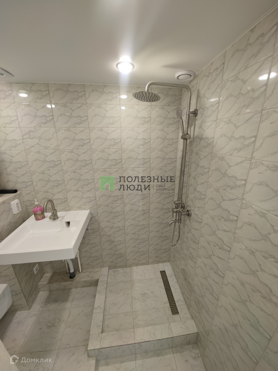 Сделан душевой поддон из плитки с трапом.