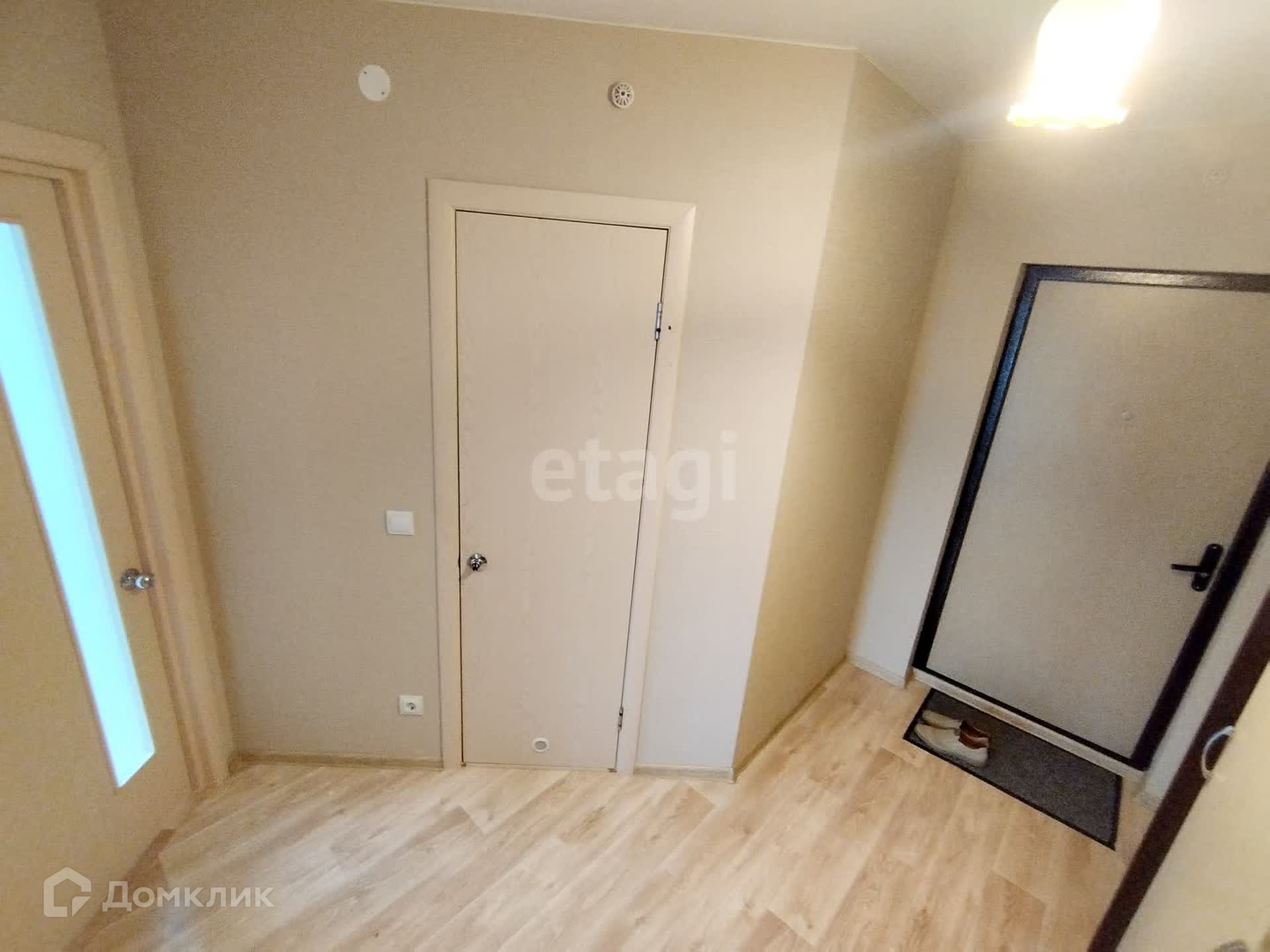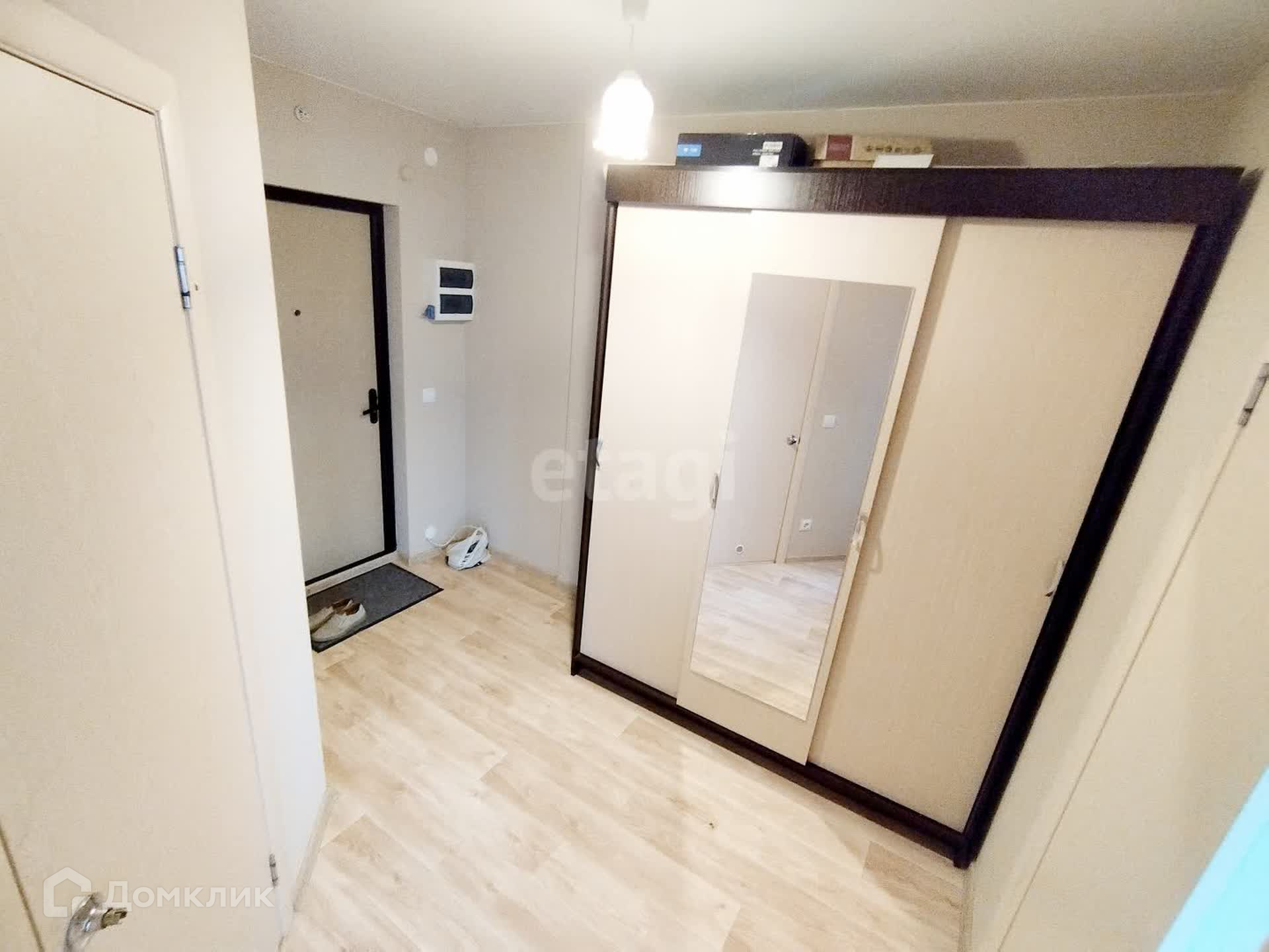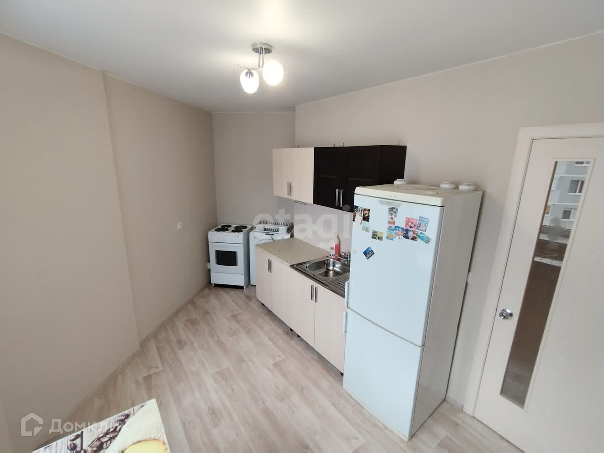 Шкаф-купе в прихожей, диван, кухонный гарнитур, холодильник, стиральная машина.