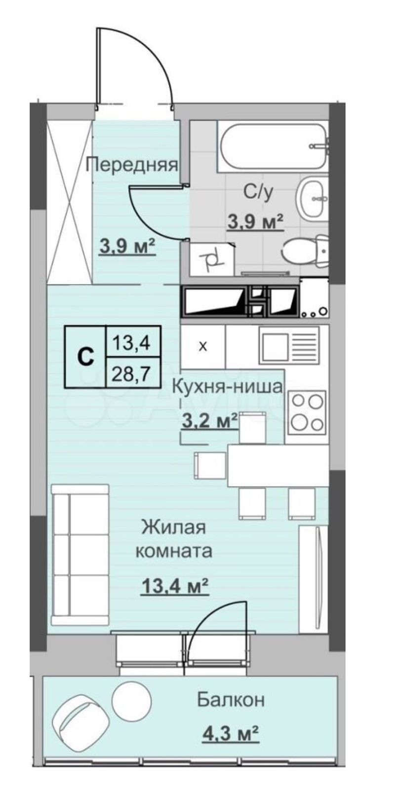 Общая площадь 29 м2
