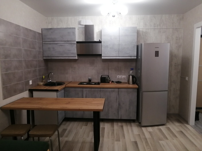 В квартире имеется кухонный гарнитур, стол, стулья, электроплита, микроволновка, электрочайник, электропечь, холодильник, телевизор, диван, спальная кровать, шкаф-купе.