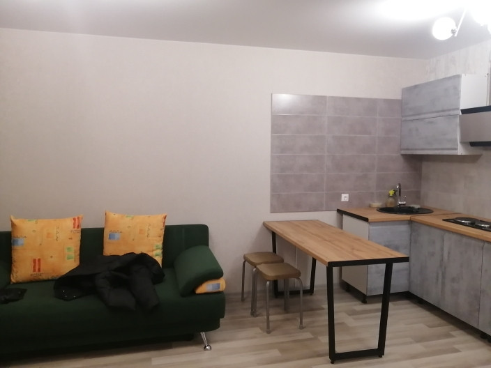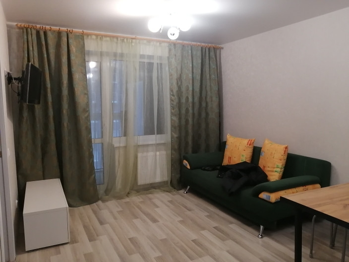 Новая 1,5 квартира, 35 кв.м. в новом доме на 3 этаже. Имеется 2 пассажирских лифта. Стоянка для машин общая за шлагбаумом.