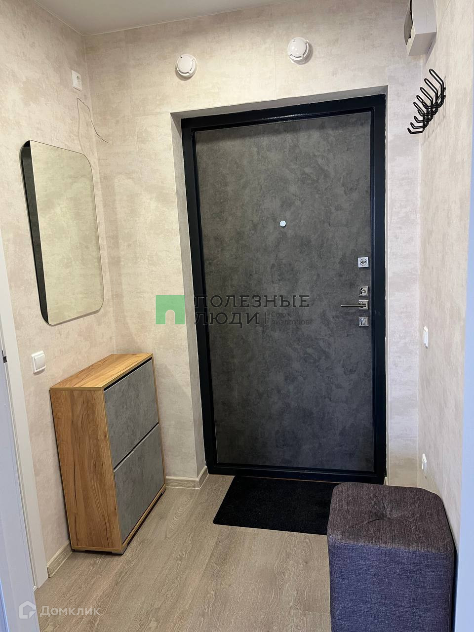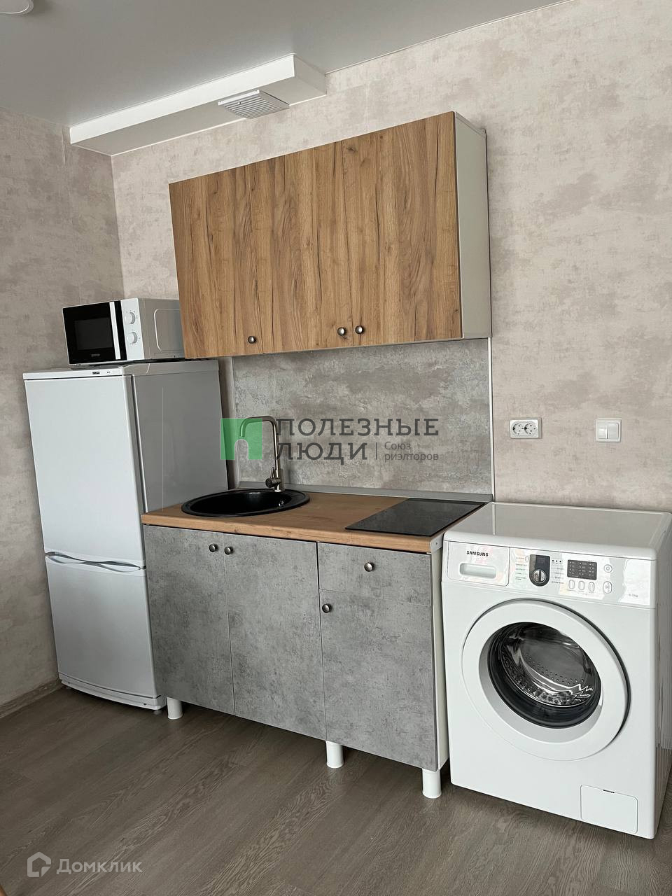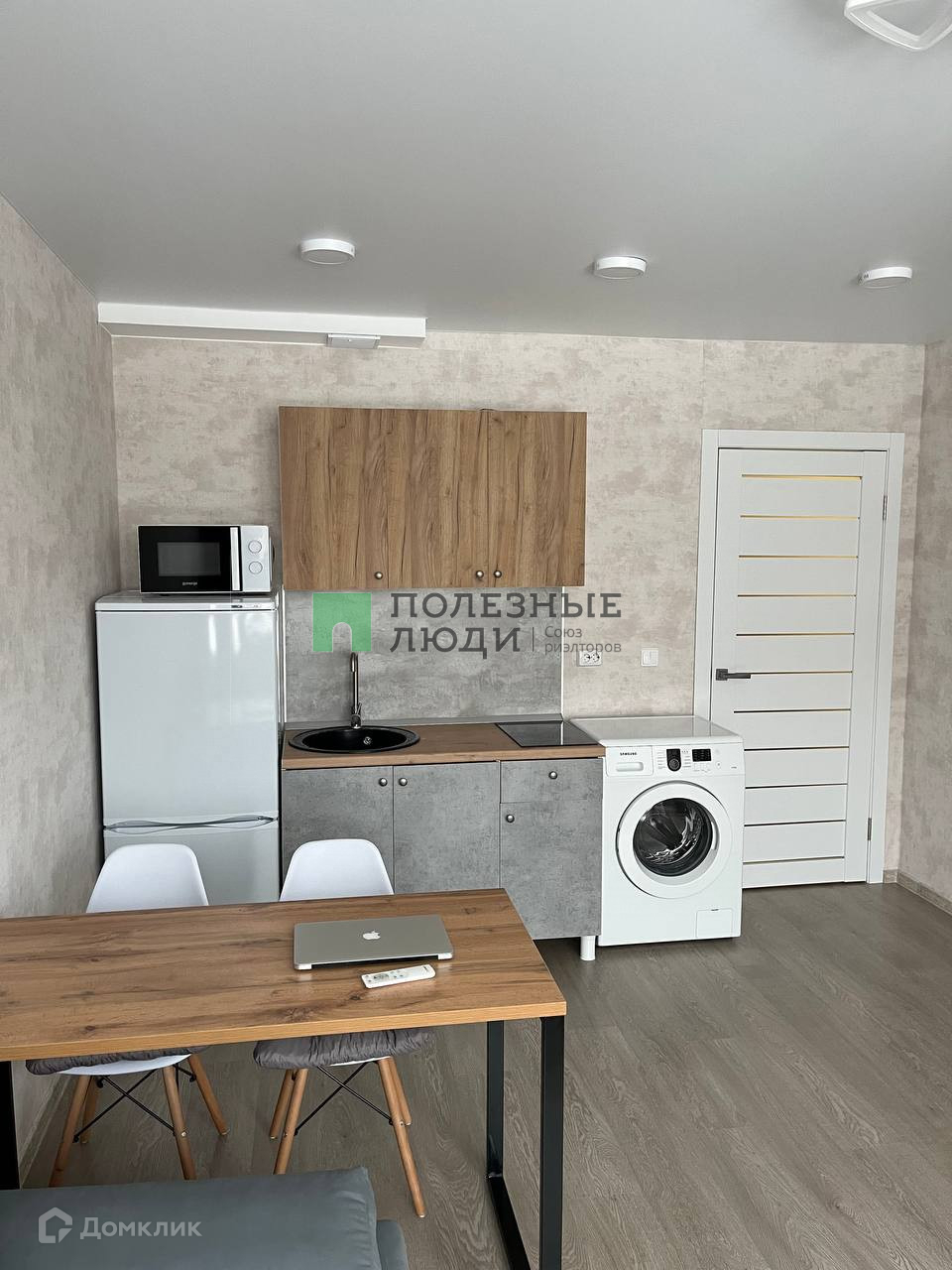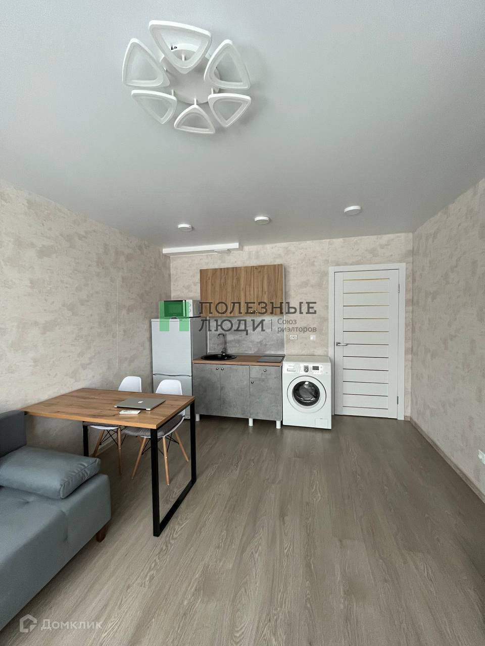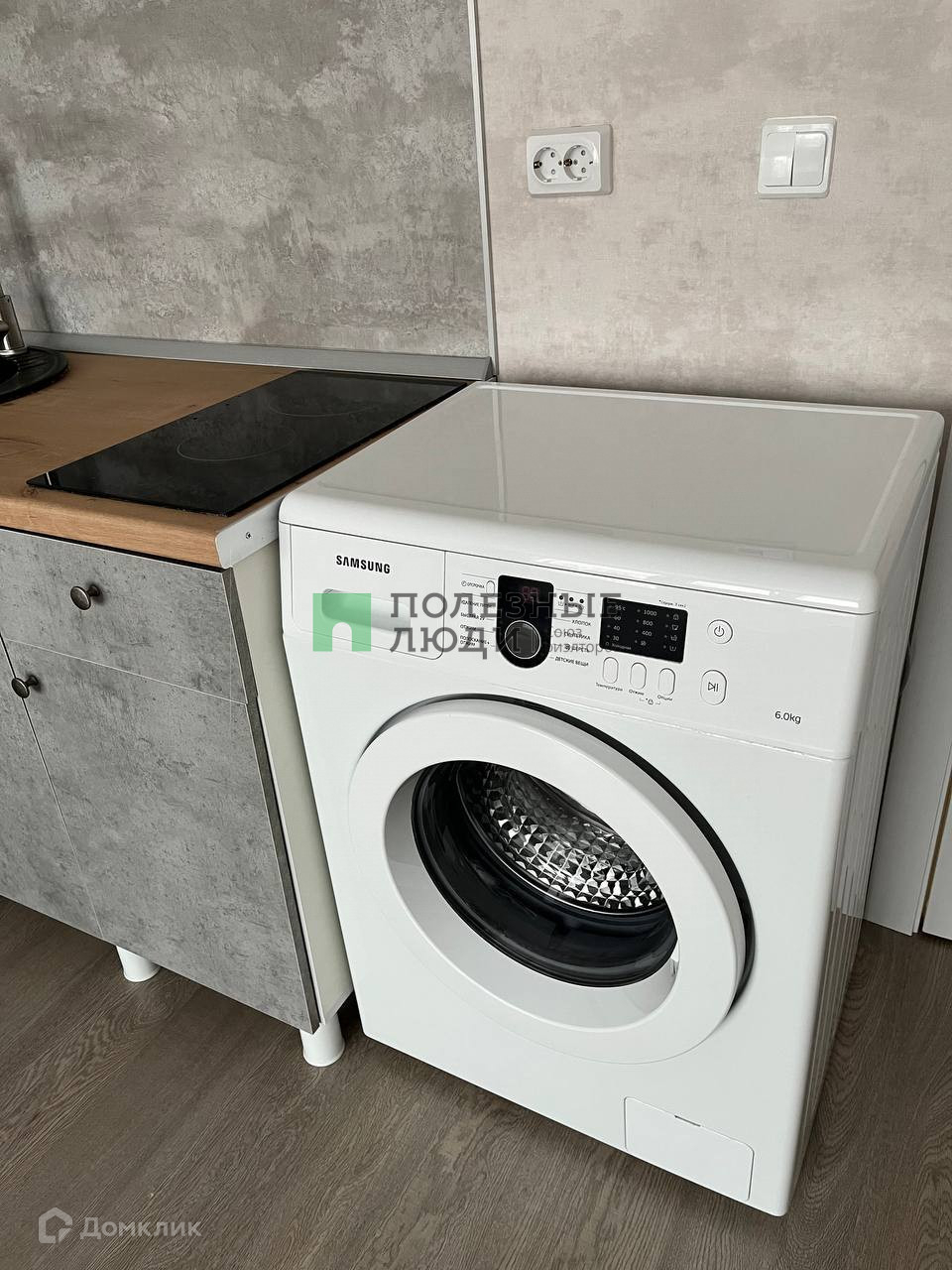В квартире: диван-кровать, огромный шкаф, большой стол, 2 стула, стиральная машина, холодильник, микроволновая печь, варочная панель, обувница и пуфик.