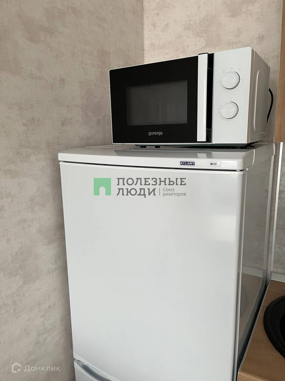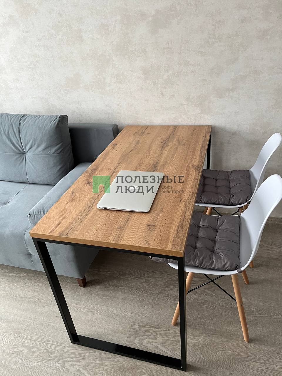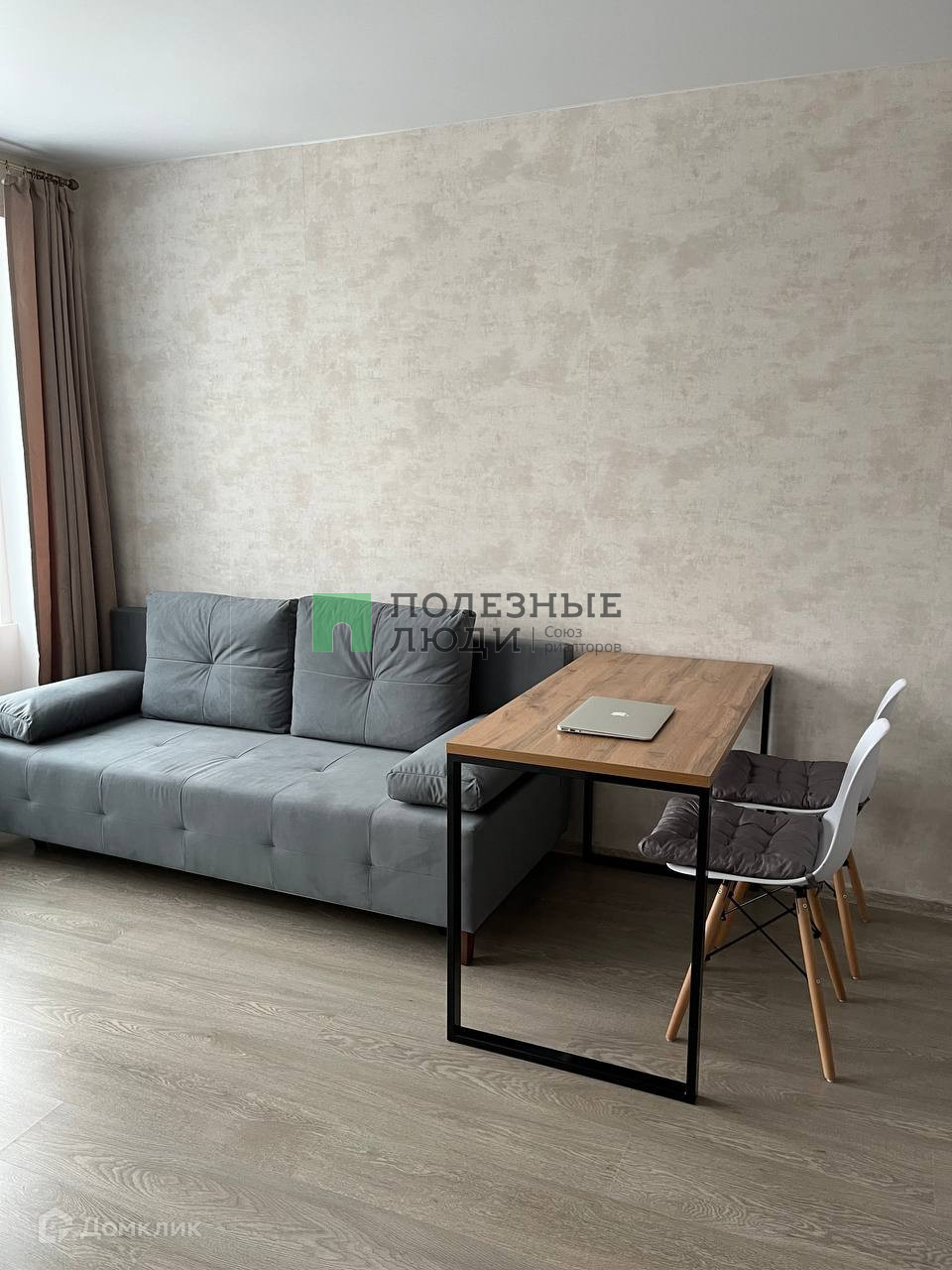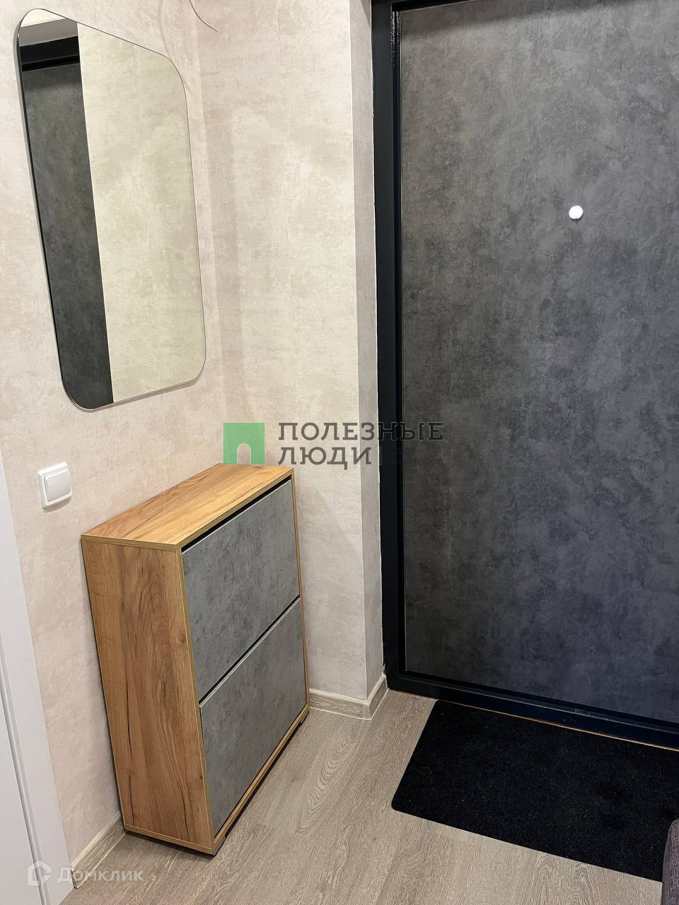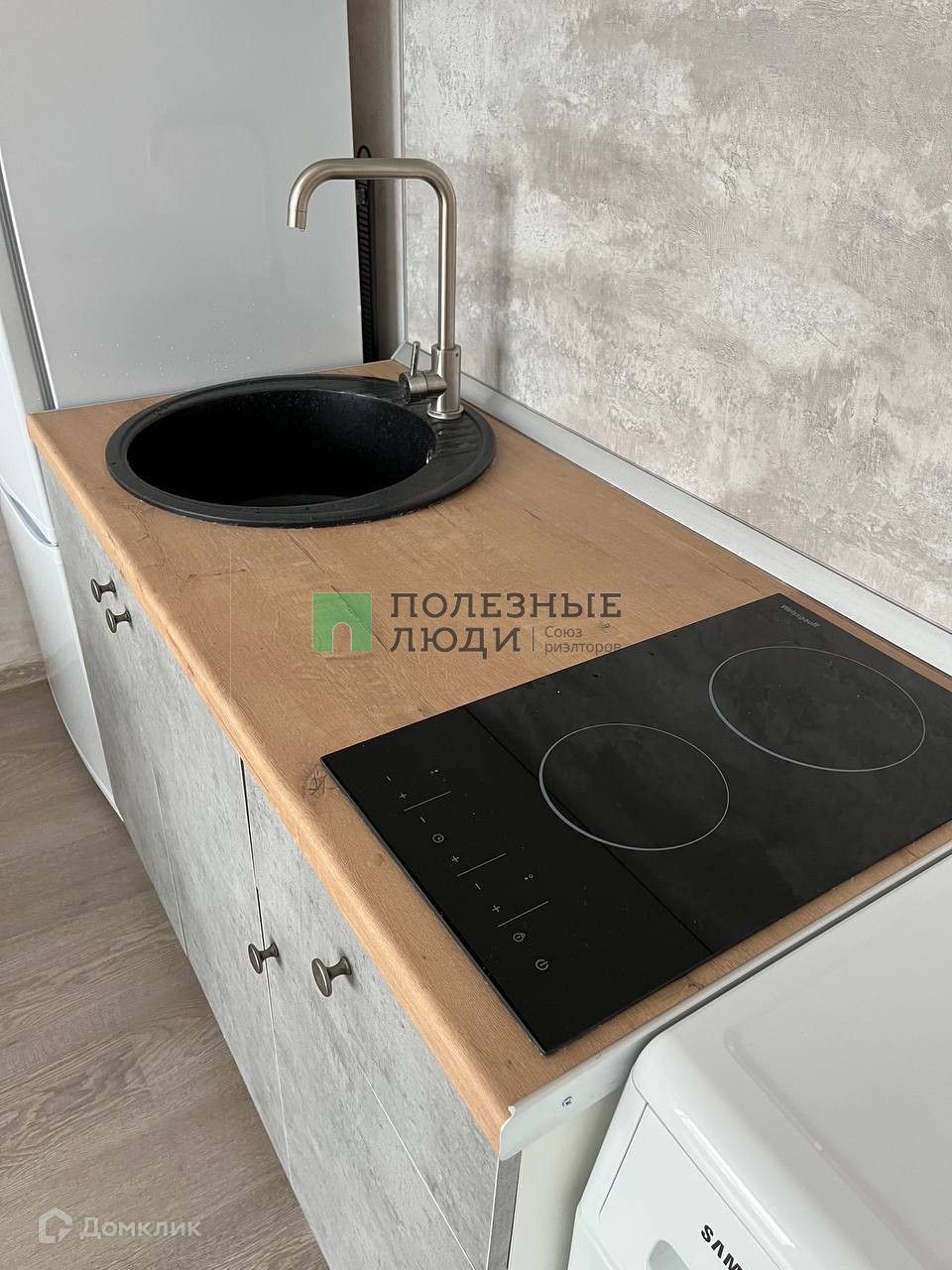 В квартире: диван-кровать, огромный шкаф, большой стол, 2 стула, стиральная машина, холодильник, микроволновая печь, варочная панель, обувница и пуфик.
