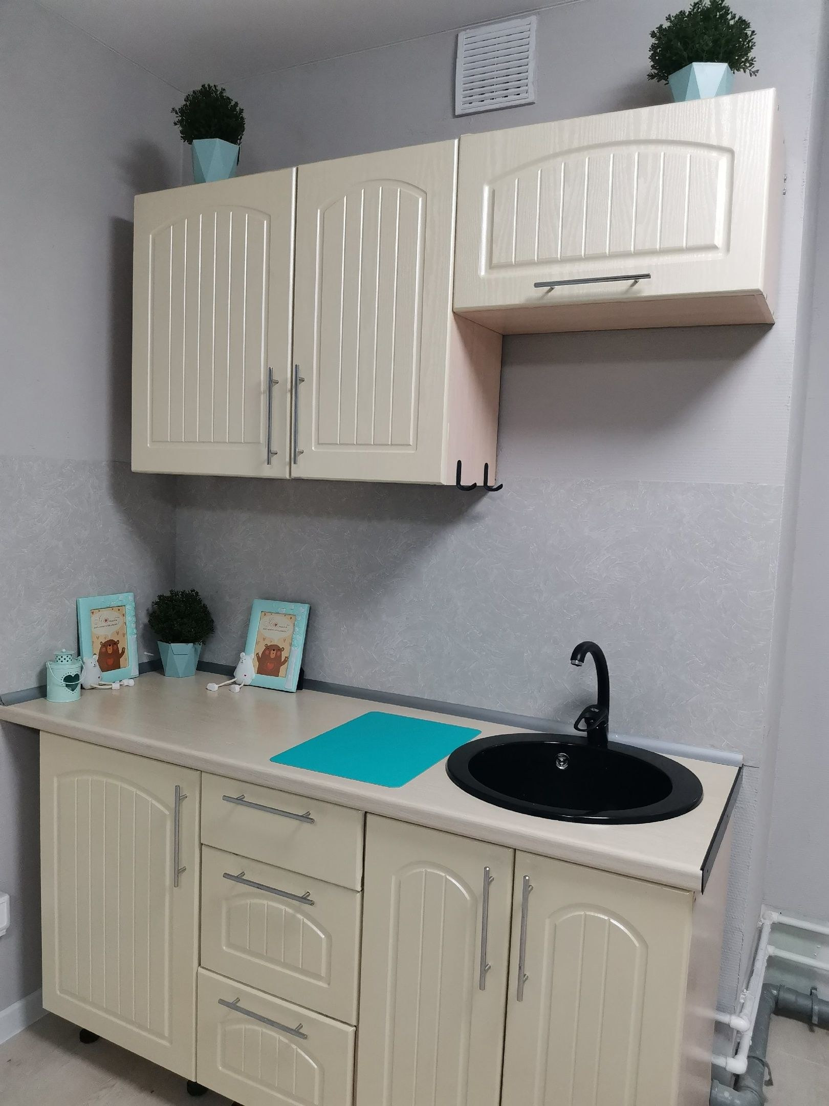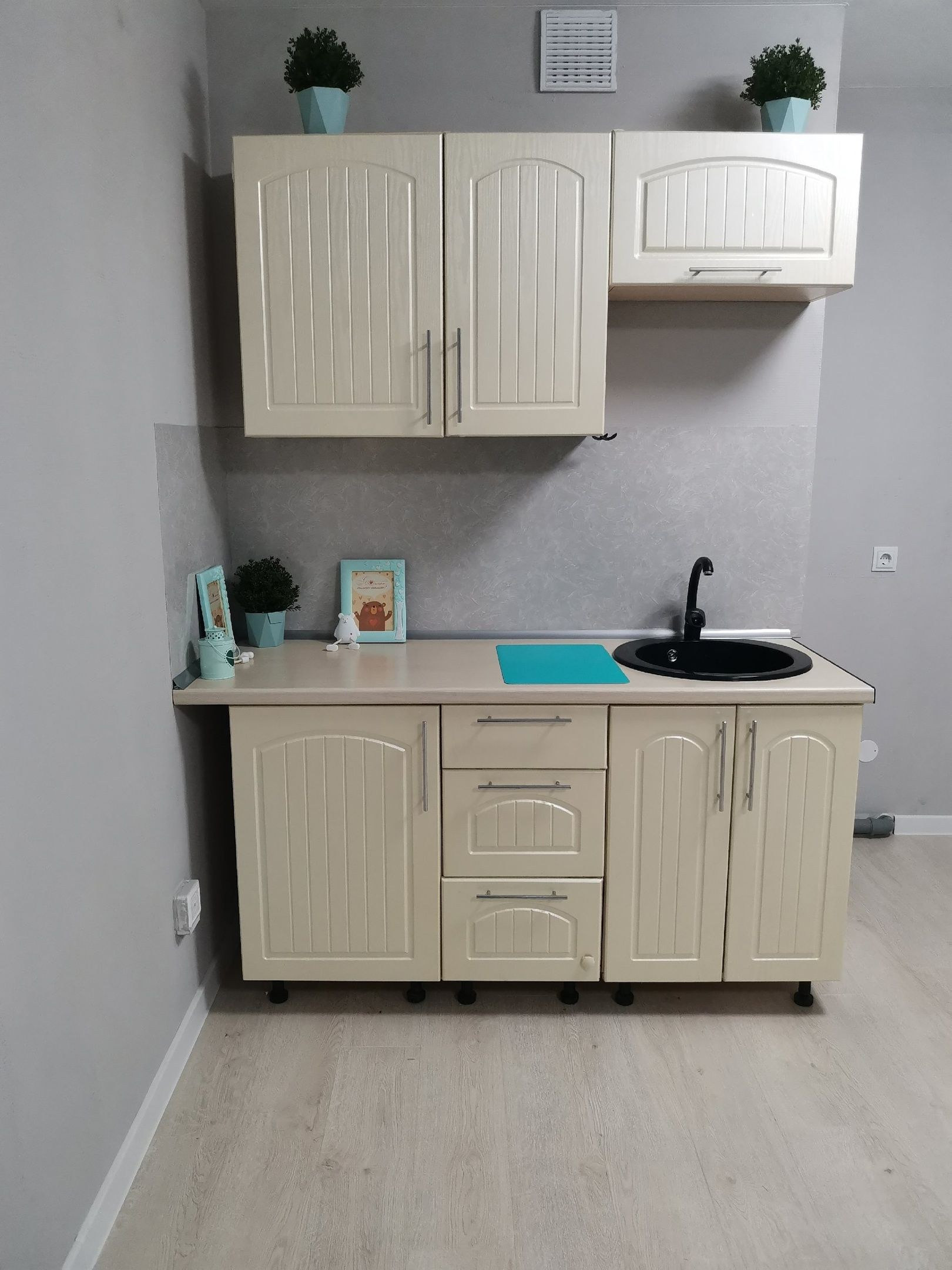 Стоит стиральная  машинка и кухонный гарнитур(можем убрать, если есть своя мебель).