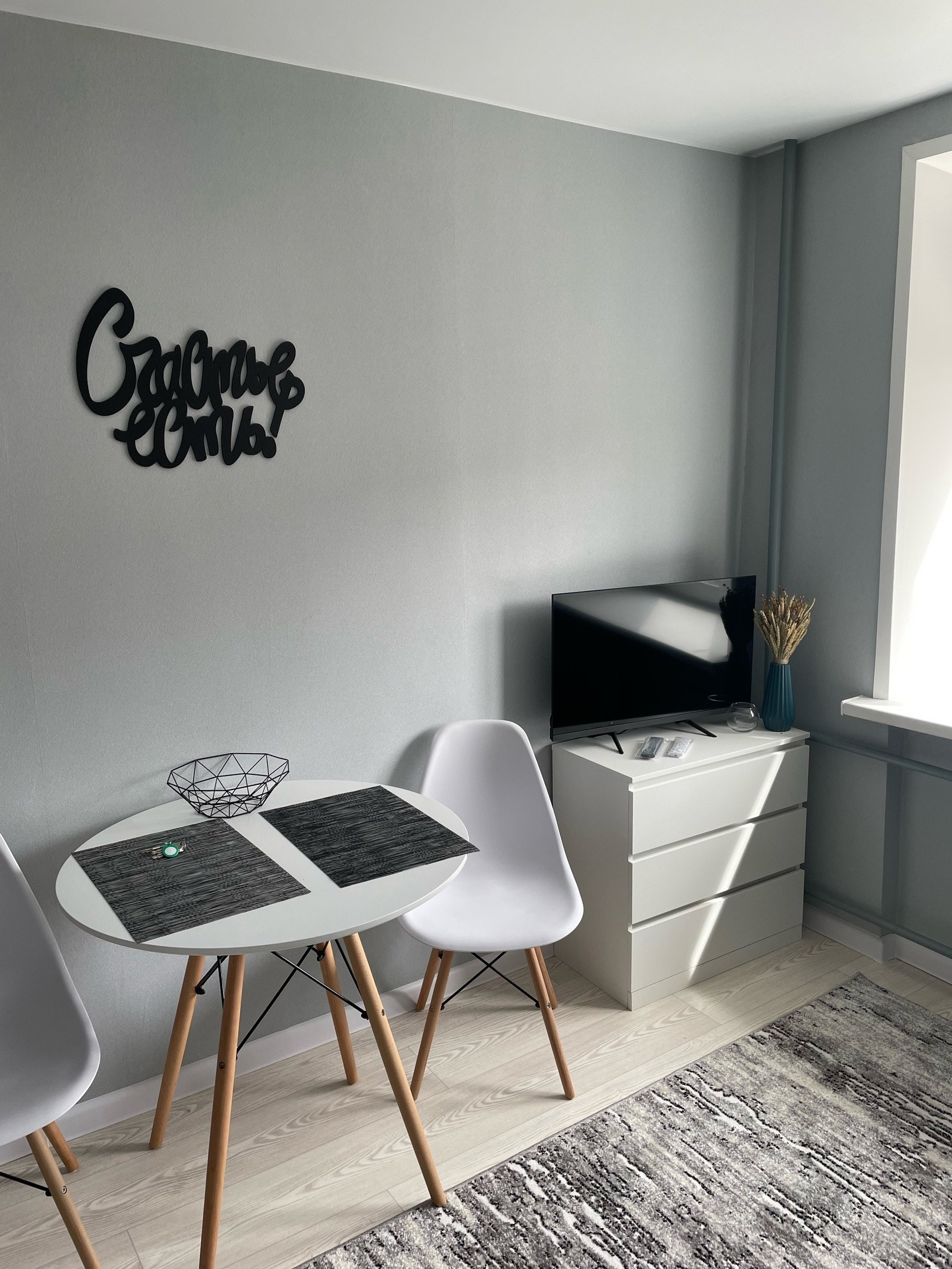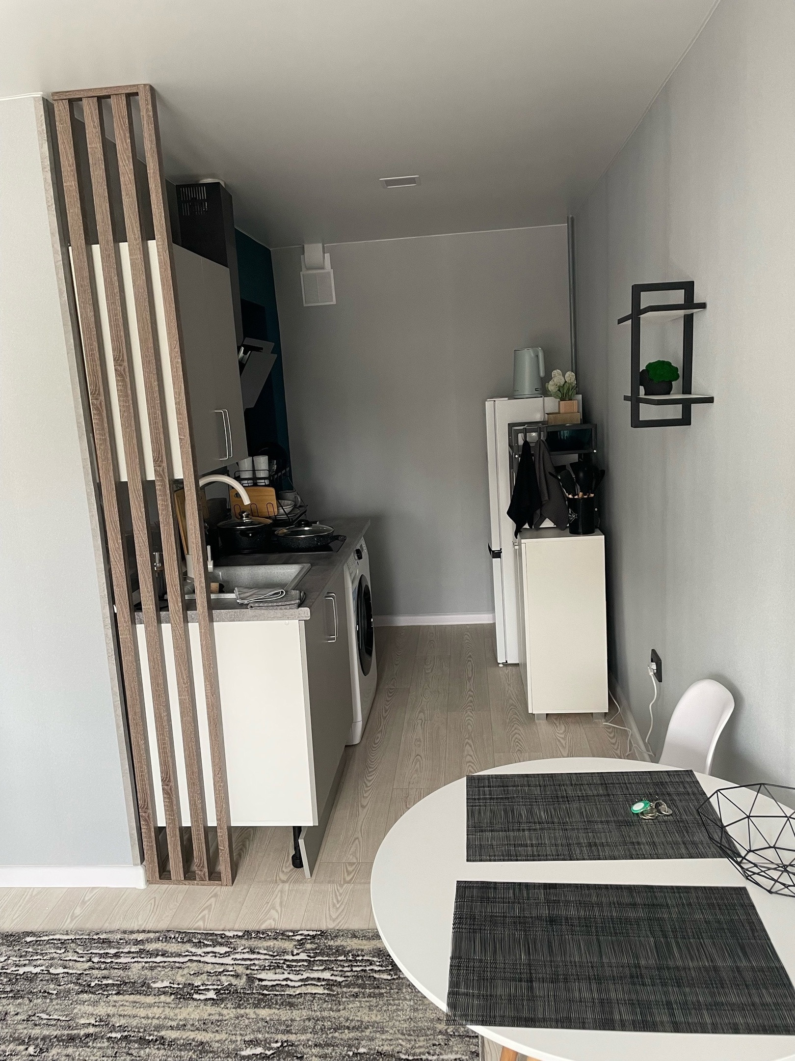 Есть все необходимое +некоторая посуда, утюг, сушилка, чайник.