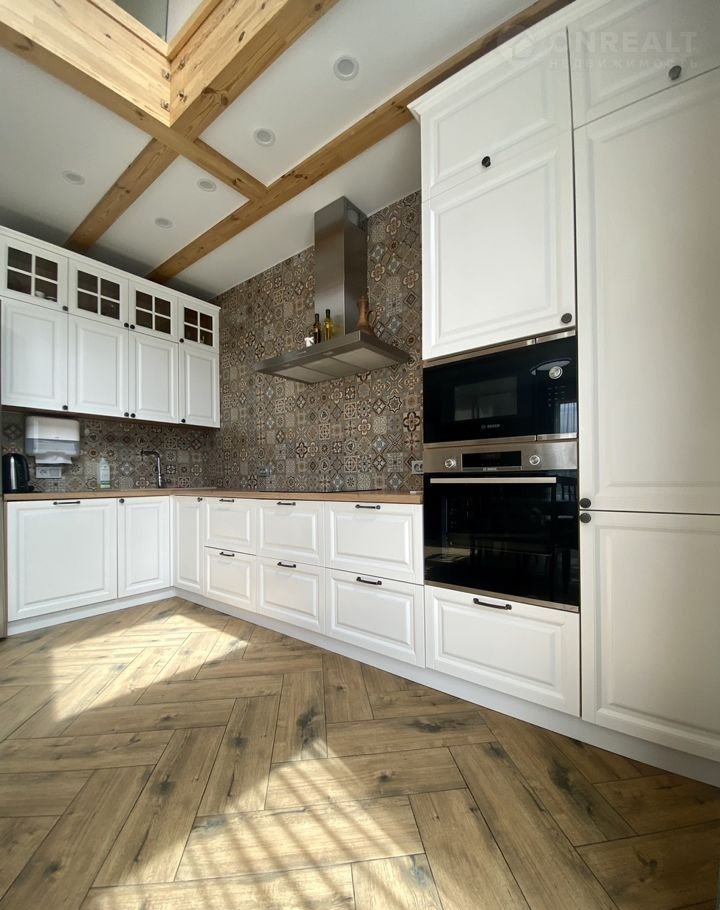 Кухня изготовлена на заказ: крашенные фасады, фартук в стиле "пэчворк", индукционная варочная поверхность, духовой шкаф и вся остальная встроенная техника надежной компании Восsh.