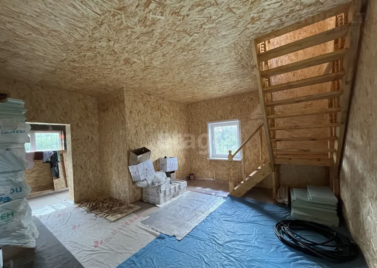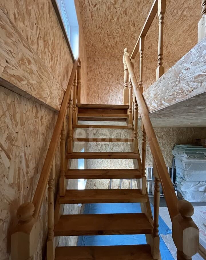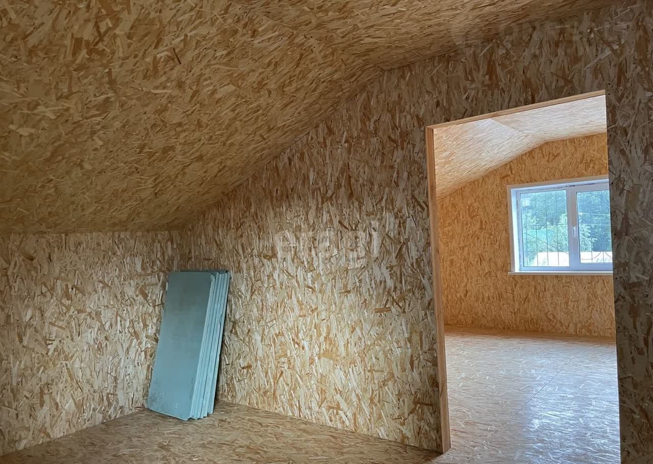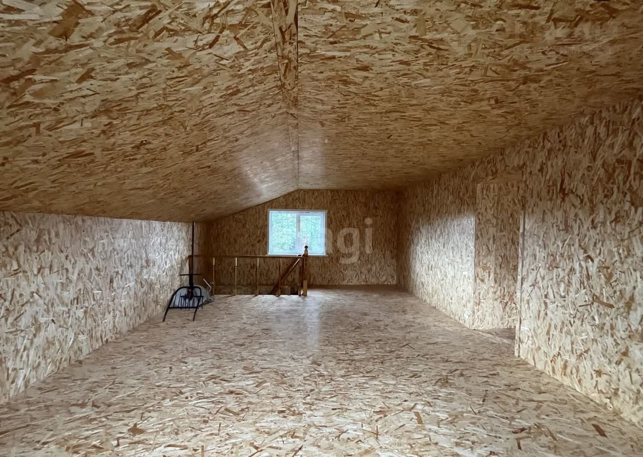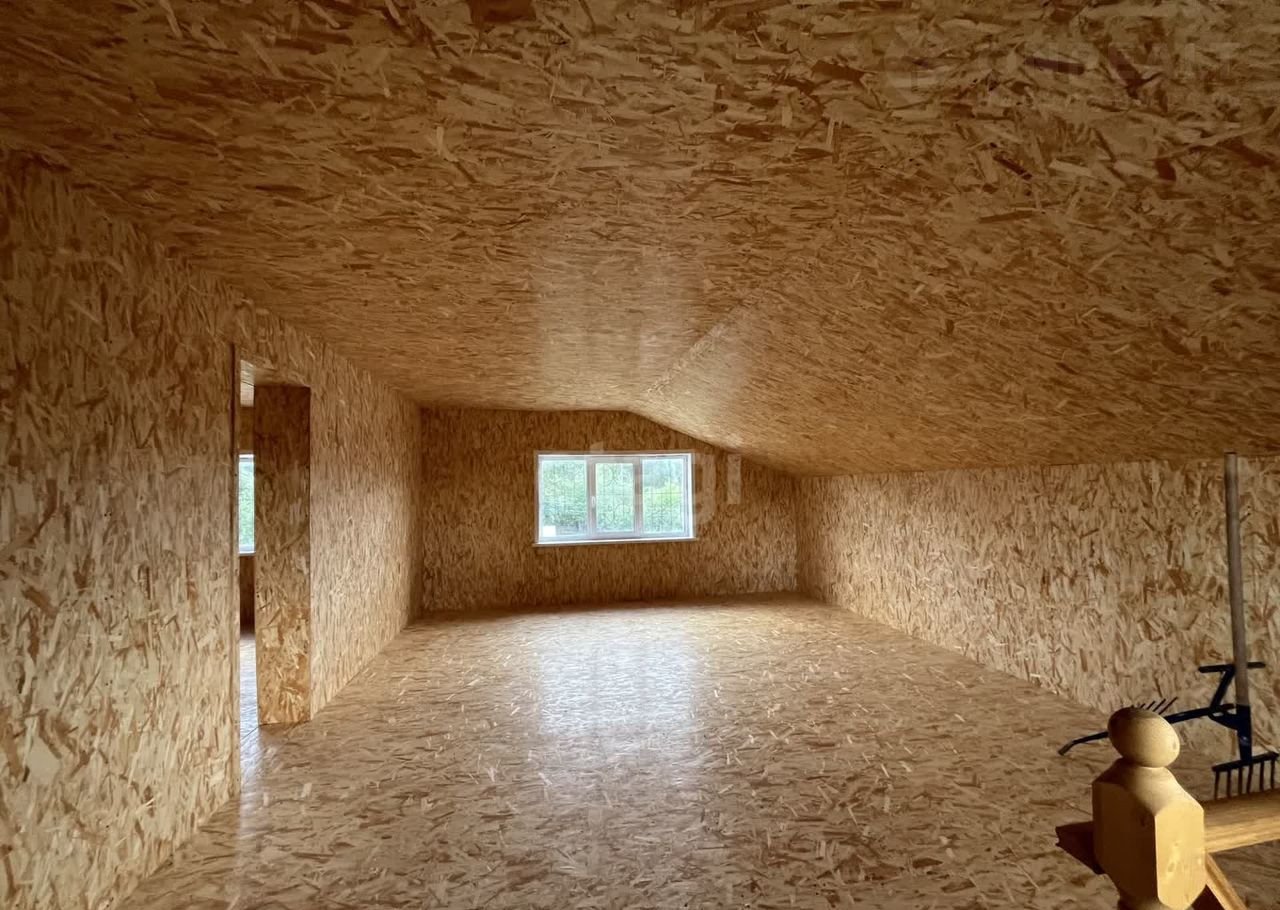 Дом (140 м2) построен из арболита — материала, который хорошо удерживает тепло, благодаря чему снижаются расходы на отопление. На первом этаже уложен тёплый пол, установлена печь, частично выполнена отделка ОСП. Второй этаж полностью отделан ОСП.