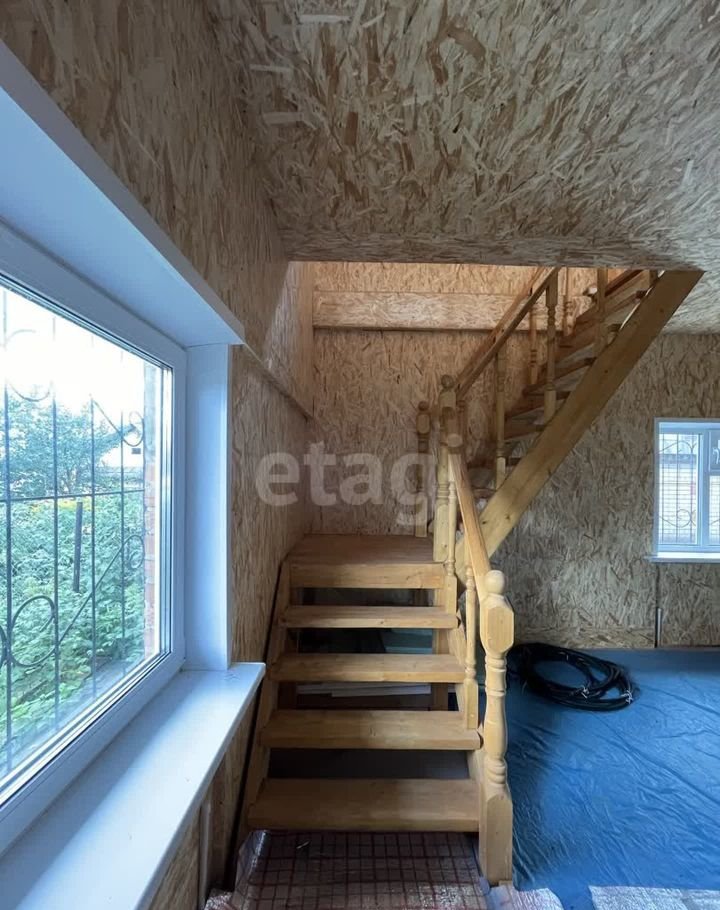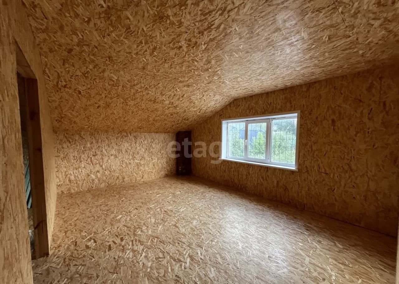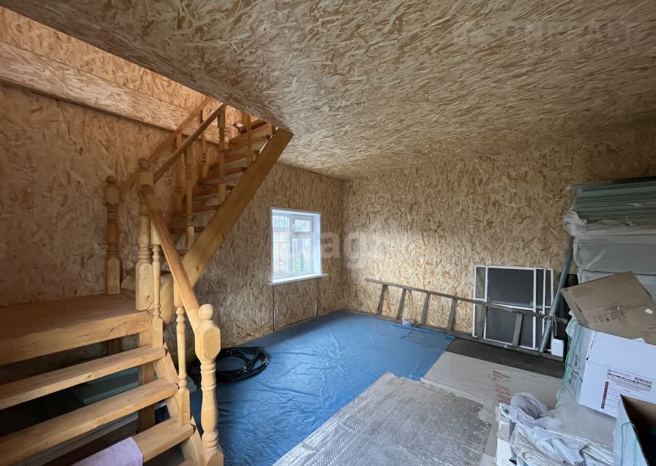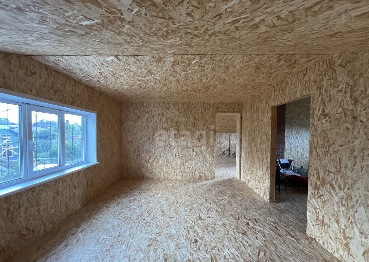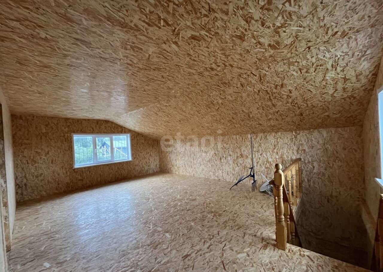 Дом (140 м2) построен из арболита — материала, который хорошо удерживает тепло, благодаря чему снижаются расходы на отопление. На первом этаже уложен тёплый пол, установлена печь, частично выполнена отделка ОСП. Второй этаж полностью отделан ОСП.